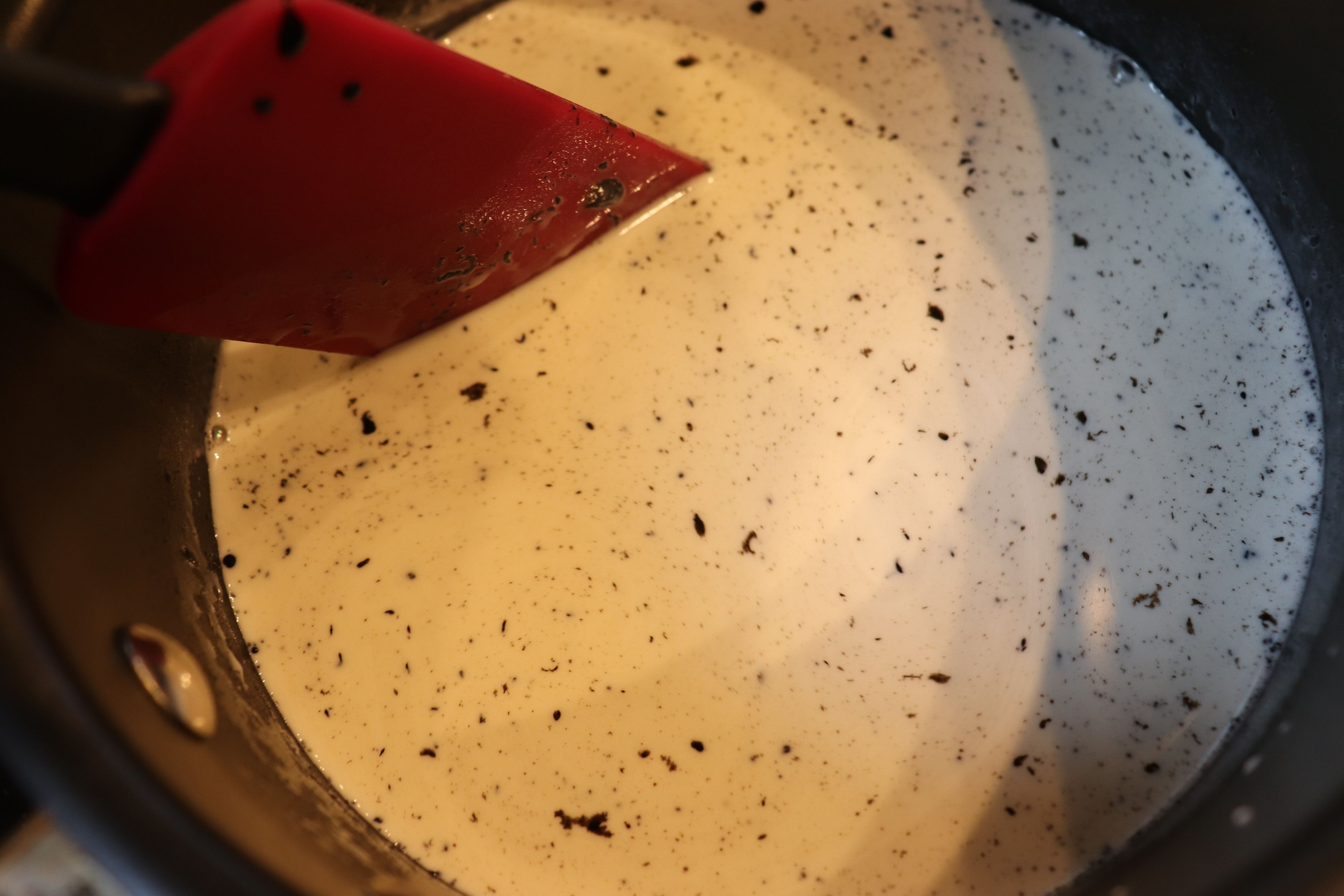 1.小鍋に牛乳、生クリームを入れて火にかけ、沸騰直前で火を止める。きび砂糖、練り黒ゴマを入れて、混ぜながら溶かす。
