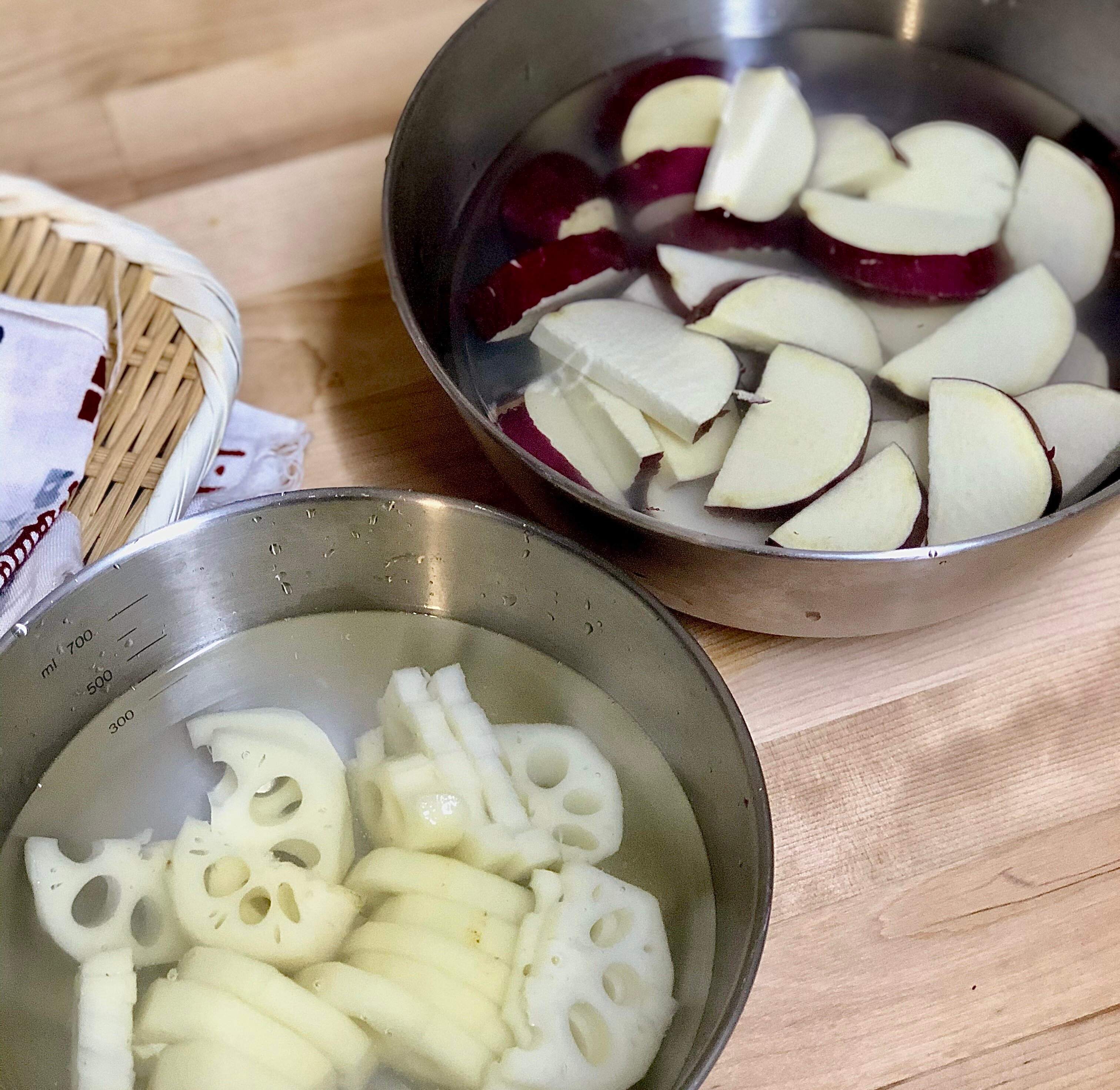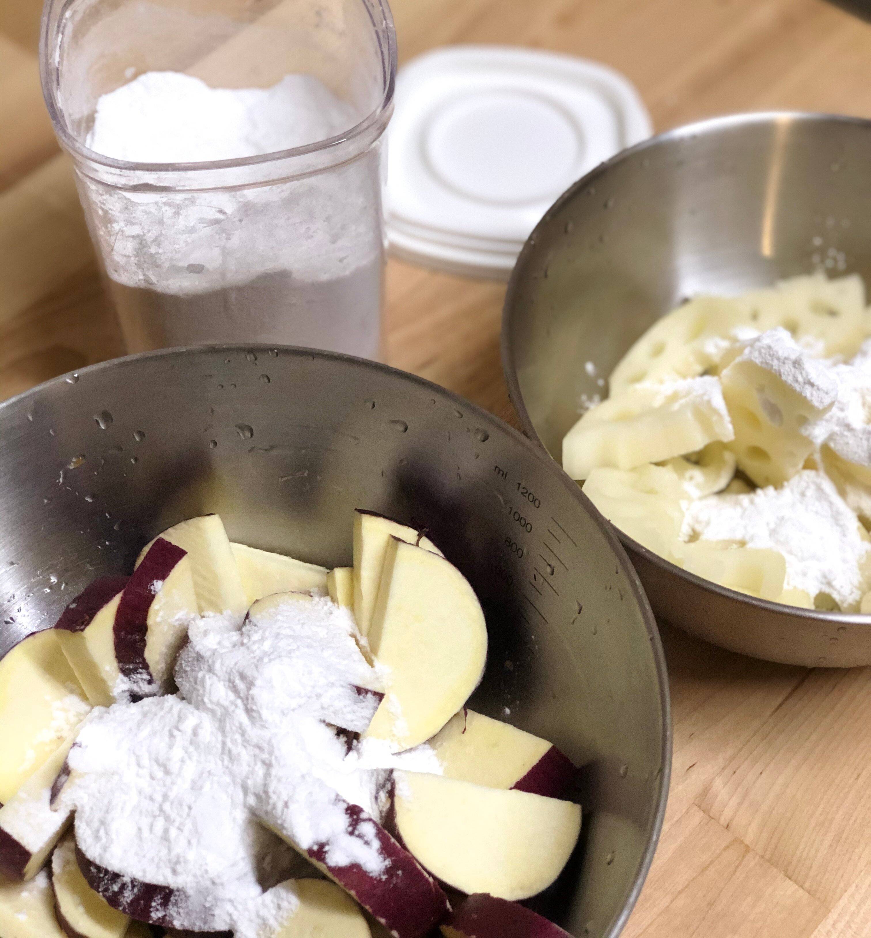 つくり方を細かく記載しましたが、さつまいもと蓮根を一緒に揚げ焼きしても大丈夫です。