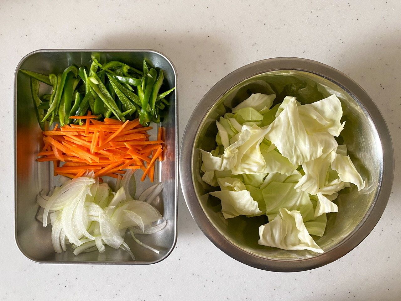 ピーマンはヘタと種を取り除き、せん切りにする。玉ねぎとにんじんは皮をむいてそれぞれ薄切り、せん切りにする。キャベツは食べやすい大きさに切り、芯の部分は薄く切る。