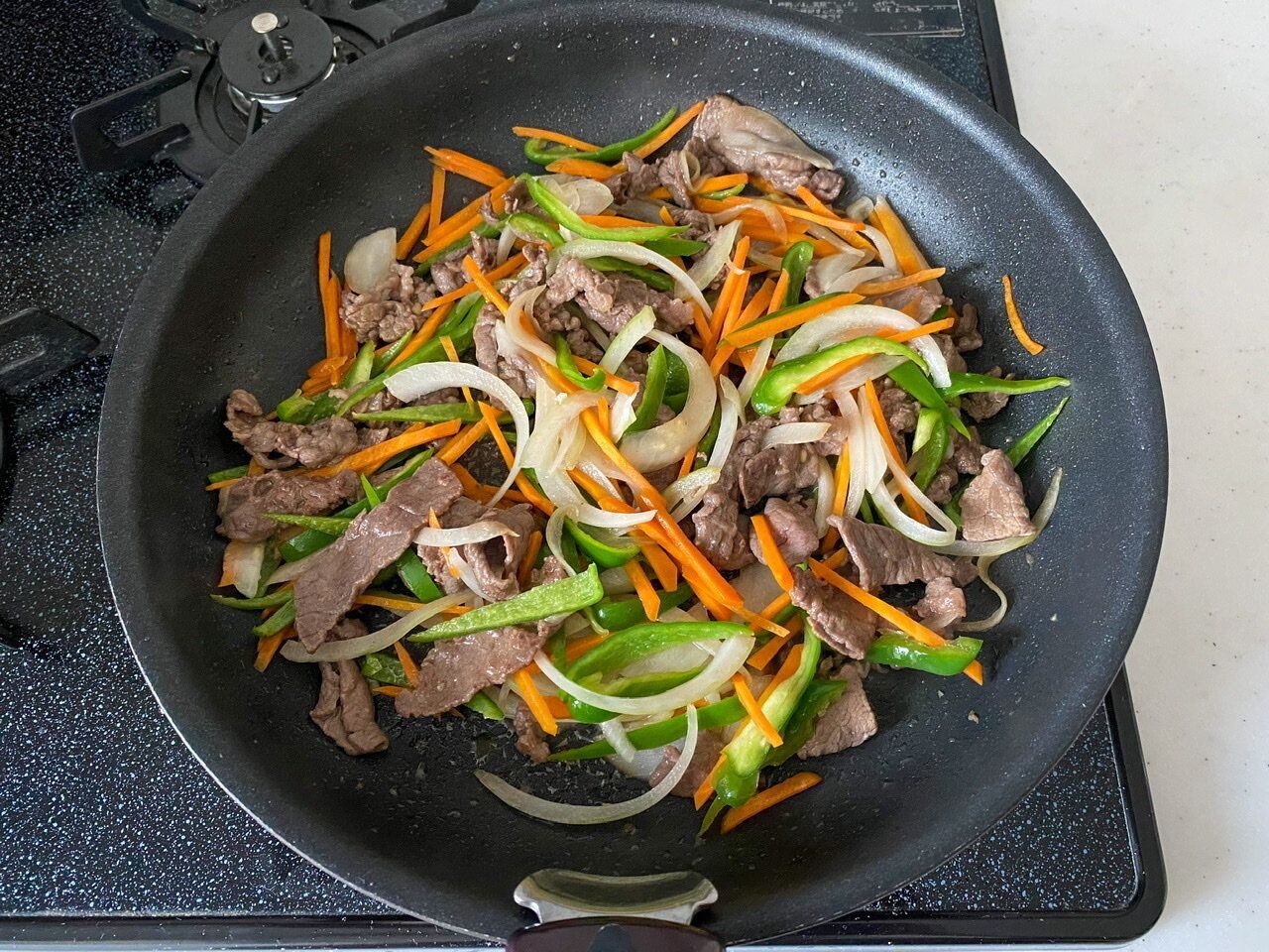 (3)フライパンにサラダ油を熱し、牛肉を炒める。色が変わったら、ピーマン、玉ねぎ、にんじんを加え、途中で鶏がらスープの素を加えてしんなりするまで炒める。