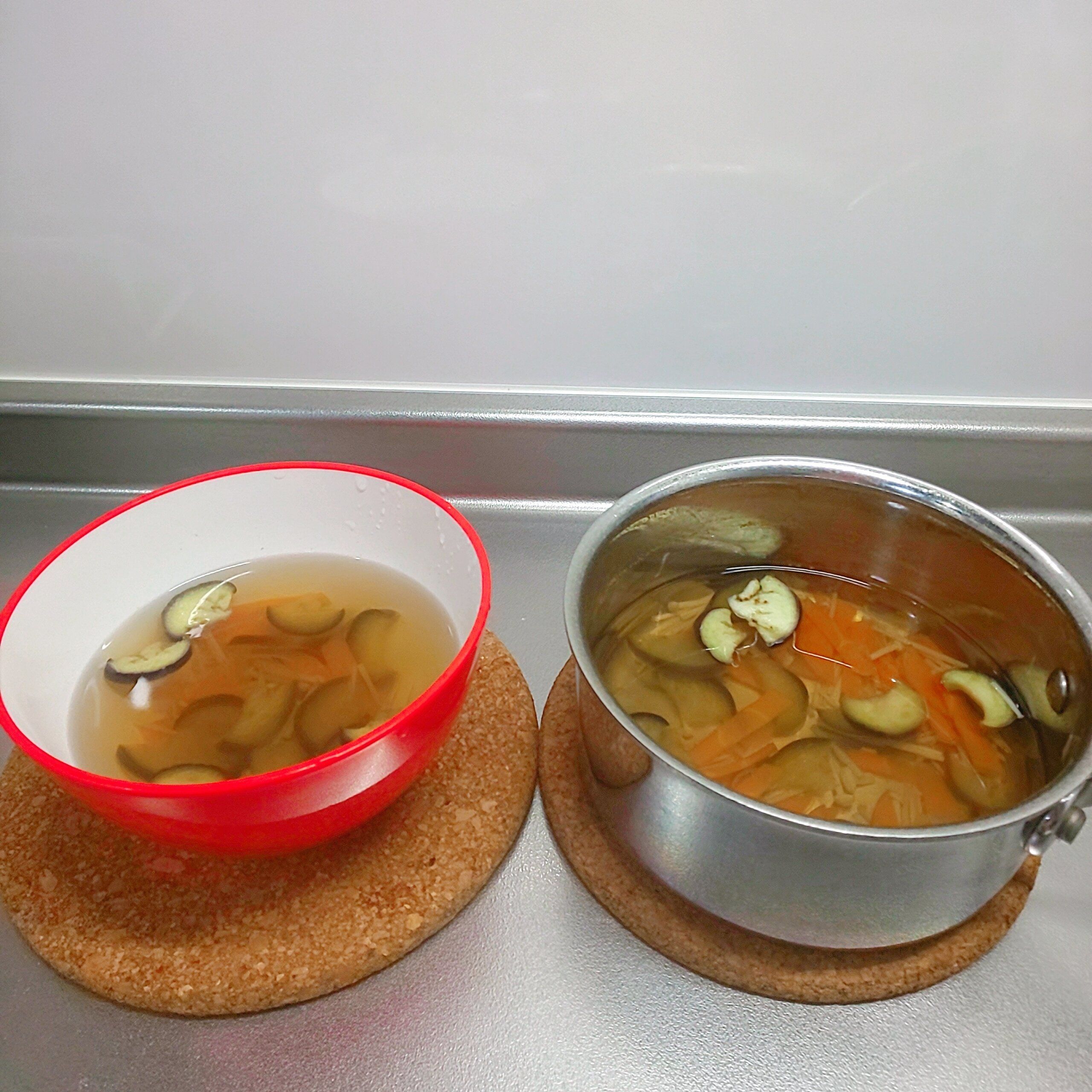 ごはんの相棒のみそ汁も手間なことは夕ごはんづくりの時に一緒にしちゃいます。炊飯と同様に、朝ごはんの分も含めた量のだし汁で具材に火を通します。みそを溶く前段階まで終わったら、ボウルに朝ごはん分を取り分けておきます。