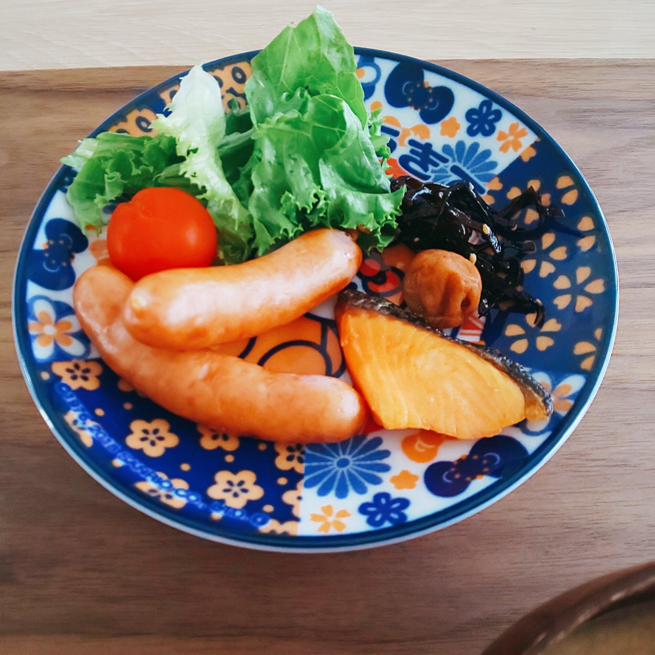 魚加工食材はちくわ、かまぼこ、はんぺんの中でどれかを常備しています。ソーセージはボイルしたり、ソテーしたりと調理法を変えたり、魚肉ソーセージにしたり…。焼き魚は鮭、ししゃも、塩サバなど安い時に買って冷凍して、前の日に冷蔵庫で解凍しています。他につくだ煮や梅干し、お漬物やミニトマトなどすぐに出せるものを準備しています。