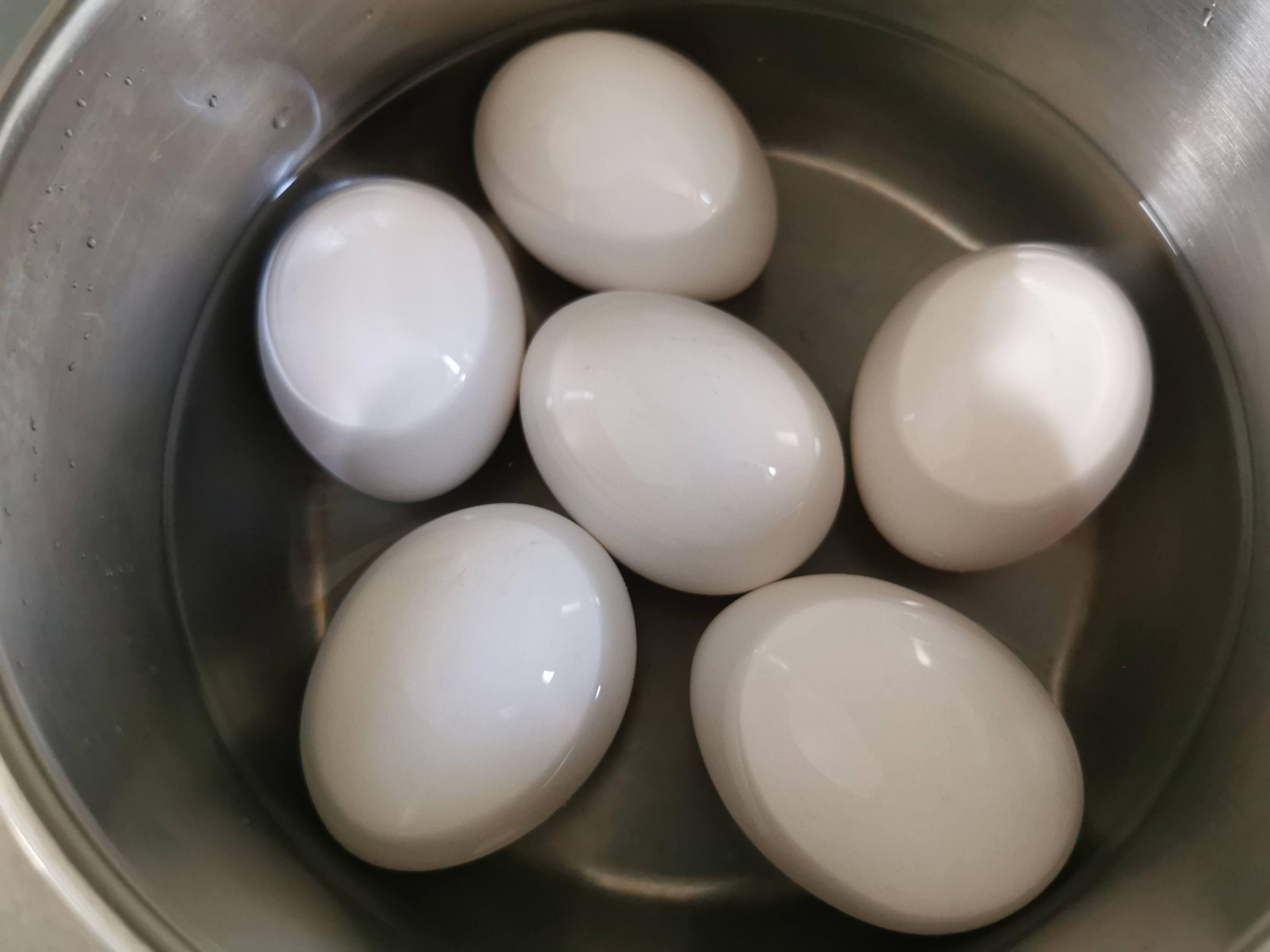 (1)好みの固さのゆで卵をつくり、殻をむく。