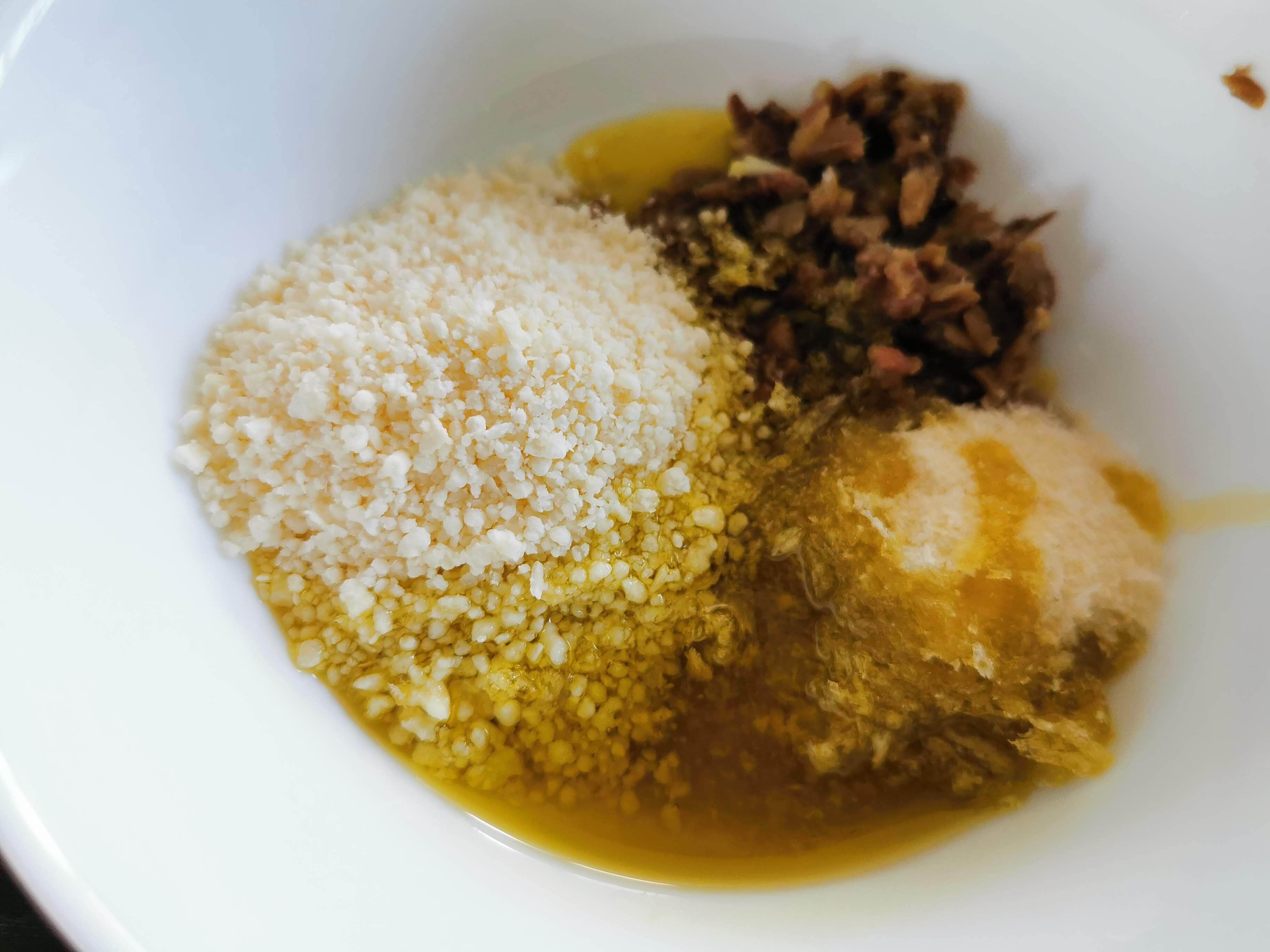 (2)刻んだアンチョビをブロッコリー以外のすべての材料とあわせて混ぜる。