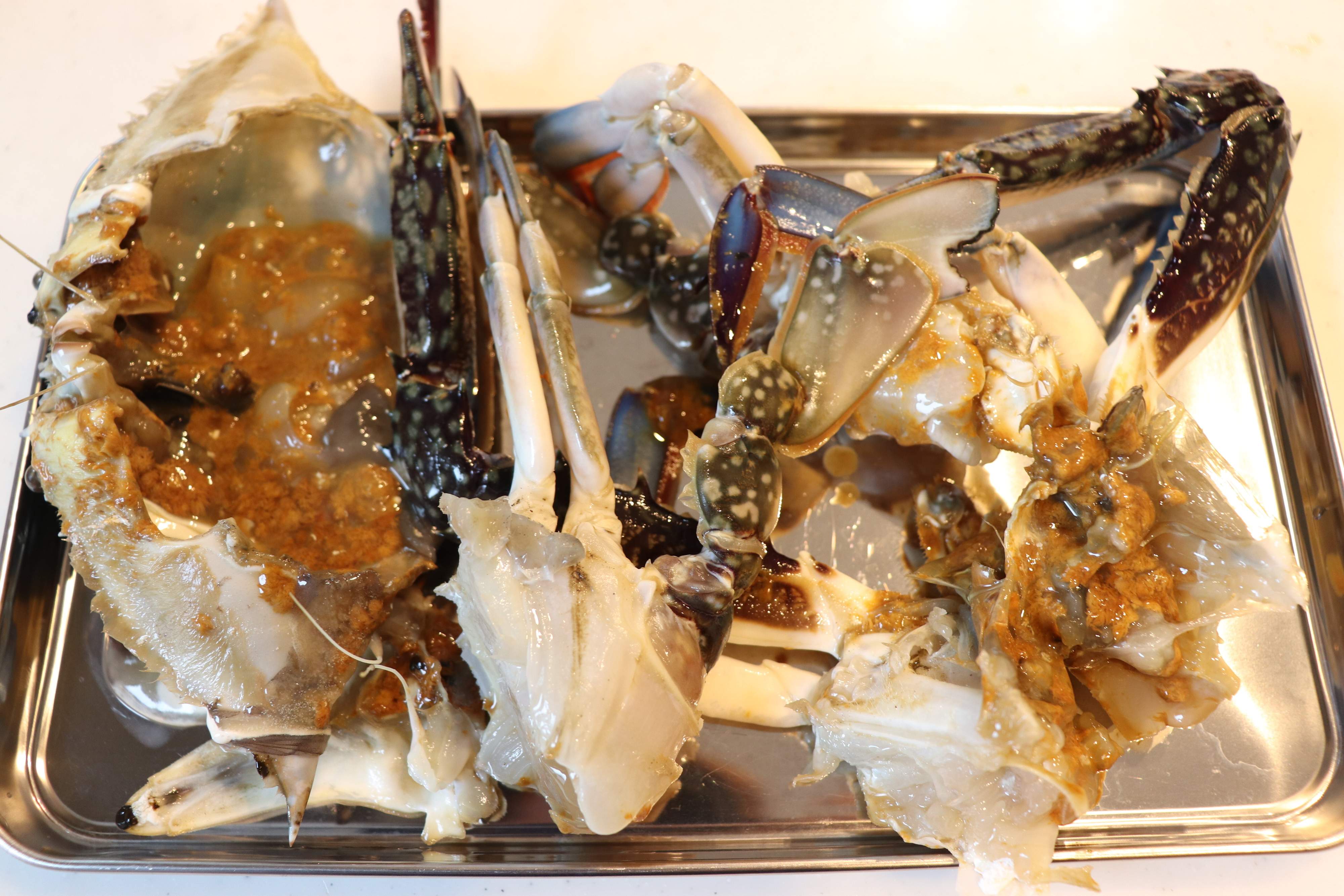 1.渡り蟹を調理しやすいように解体、カットする。