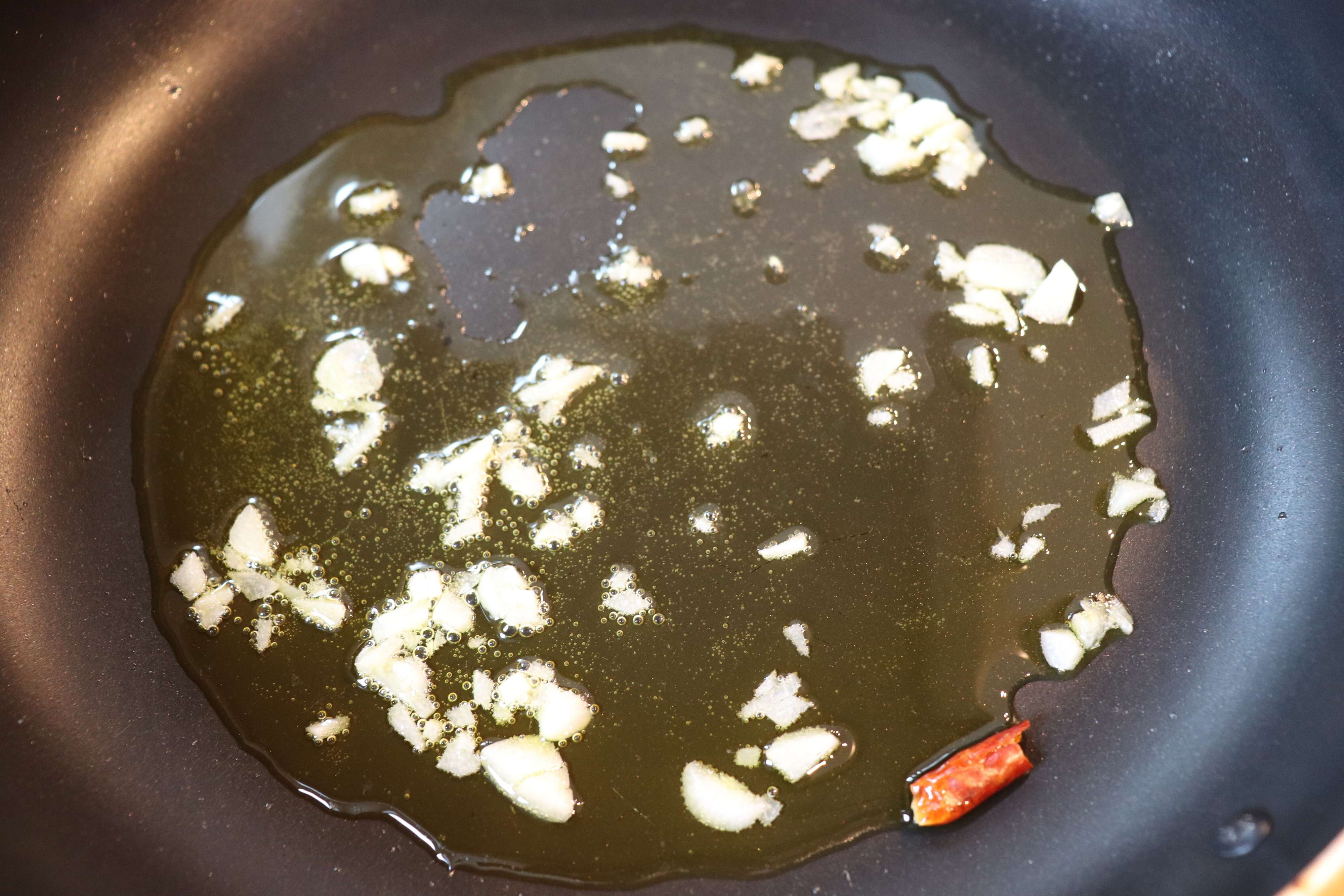 2.フライパンにみじん切りにしたにんにくとオリーブオイルを入れて、弱火で香りをうつす。鷹の爪を入れて、辛味をうつす。