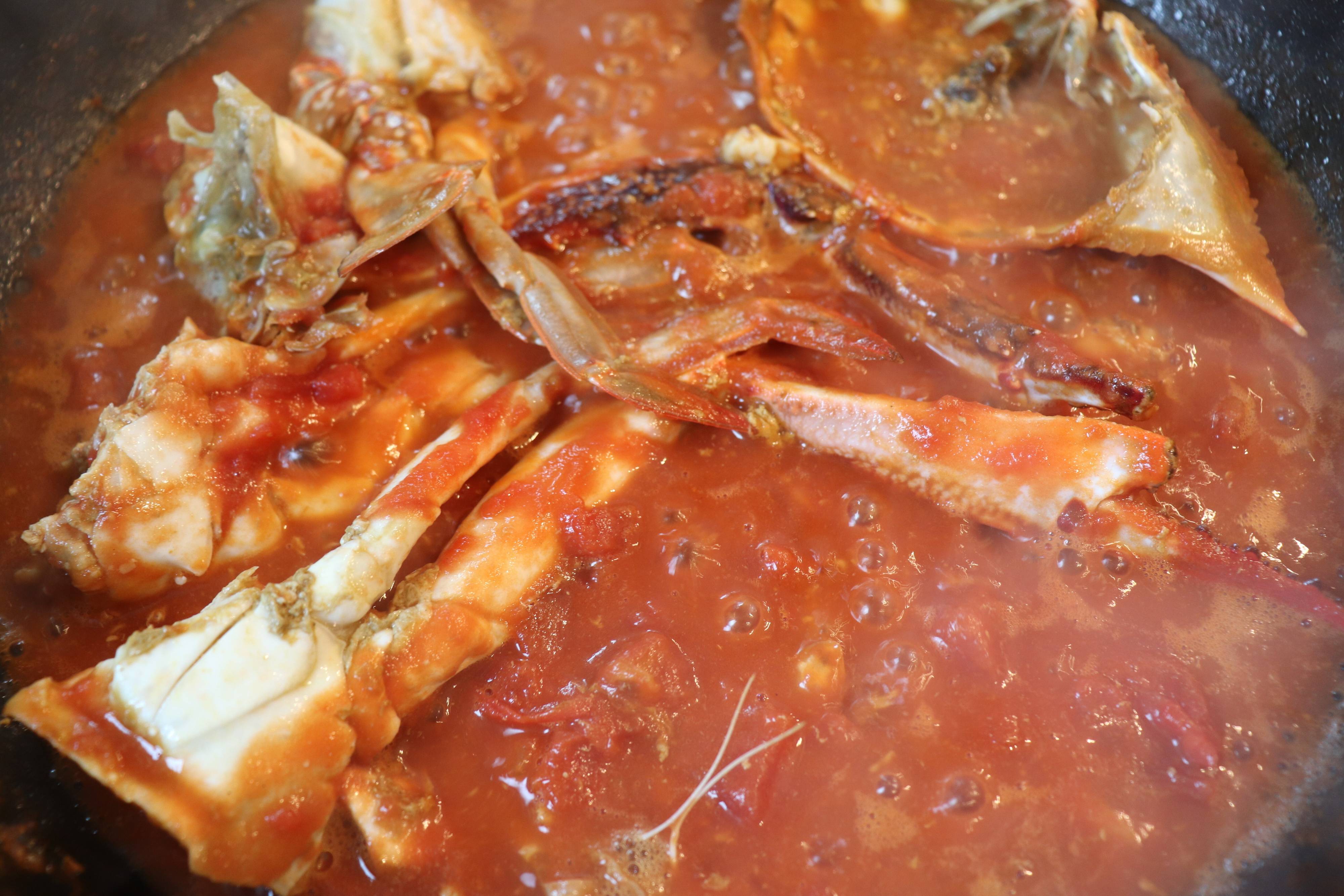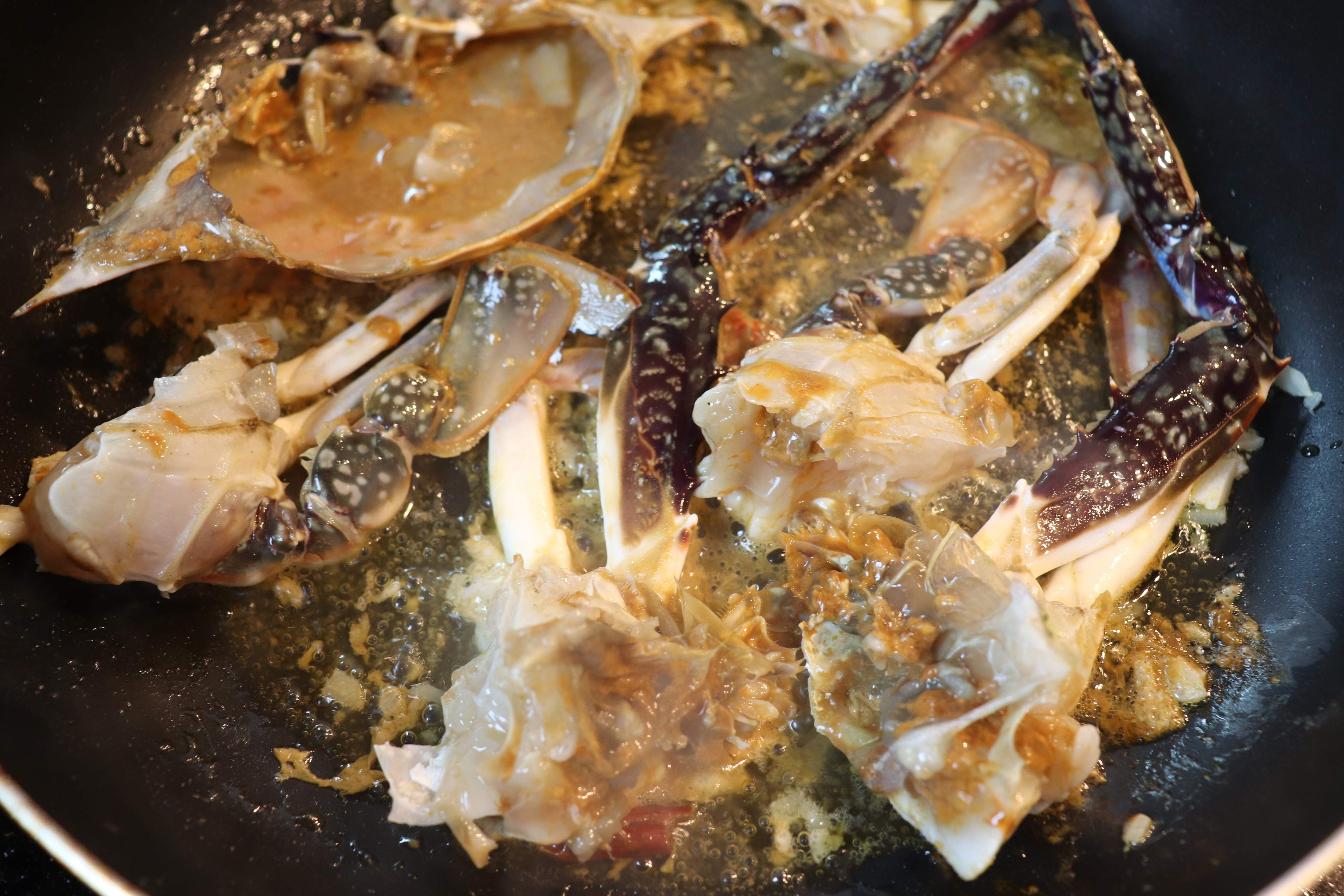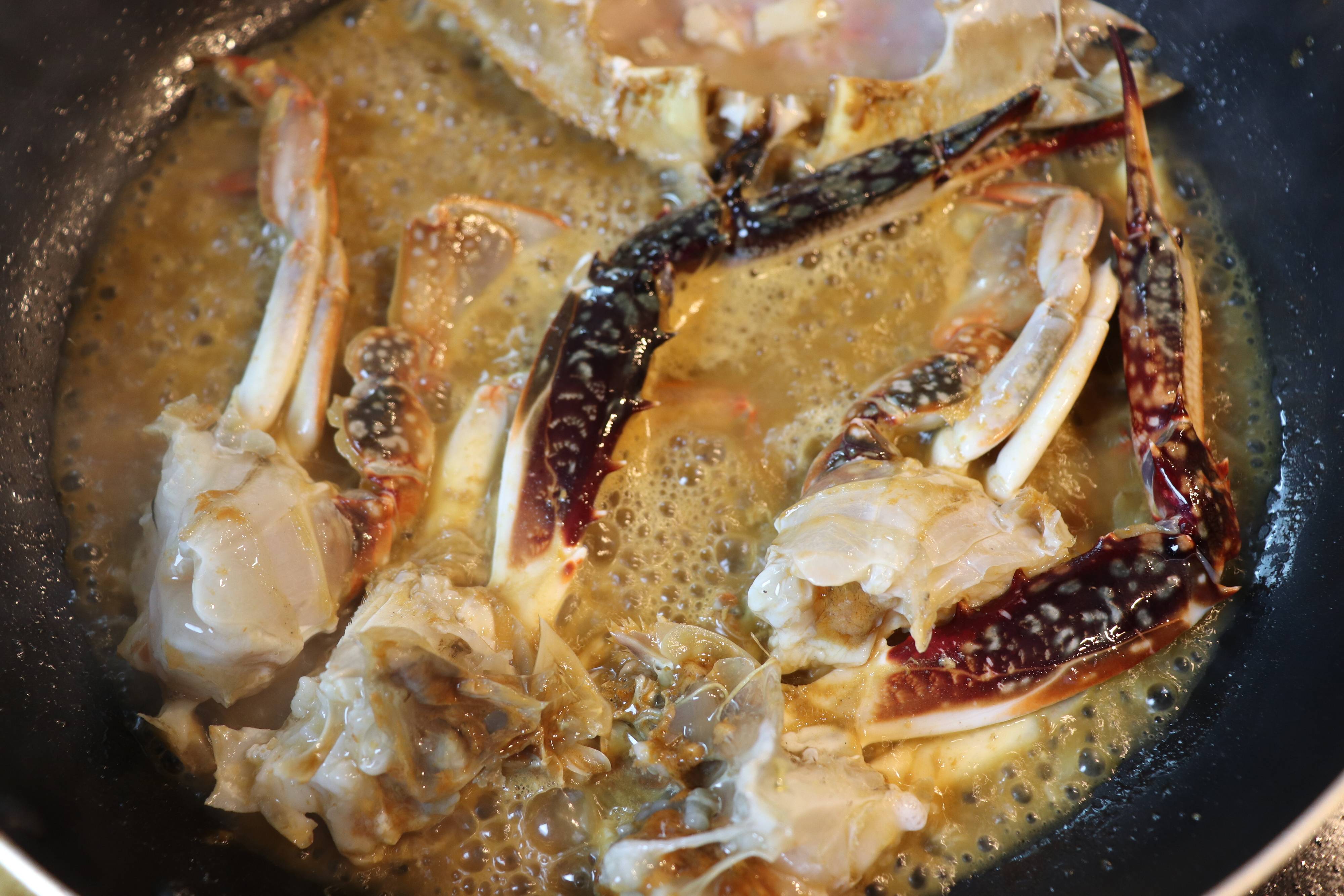 3.火を強め、渡り蟹を入れて、炒める。