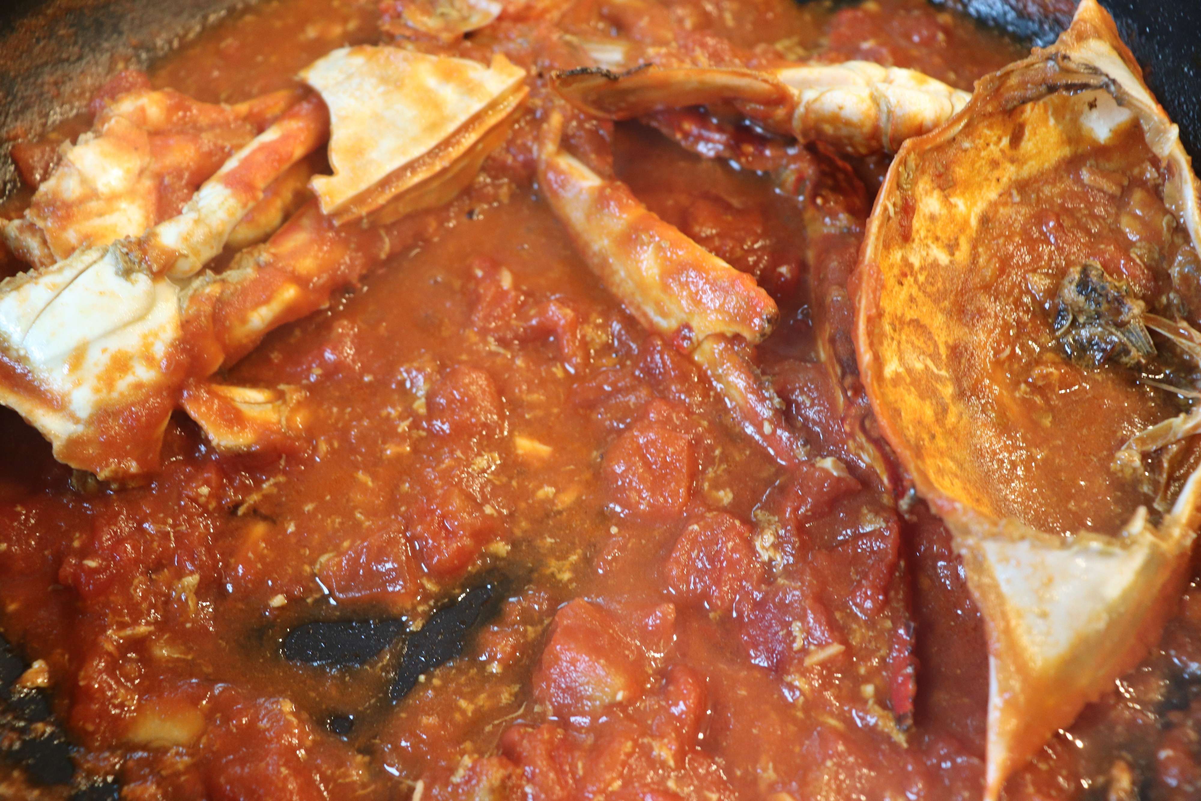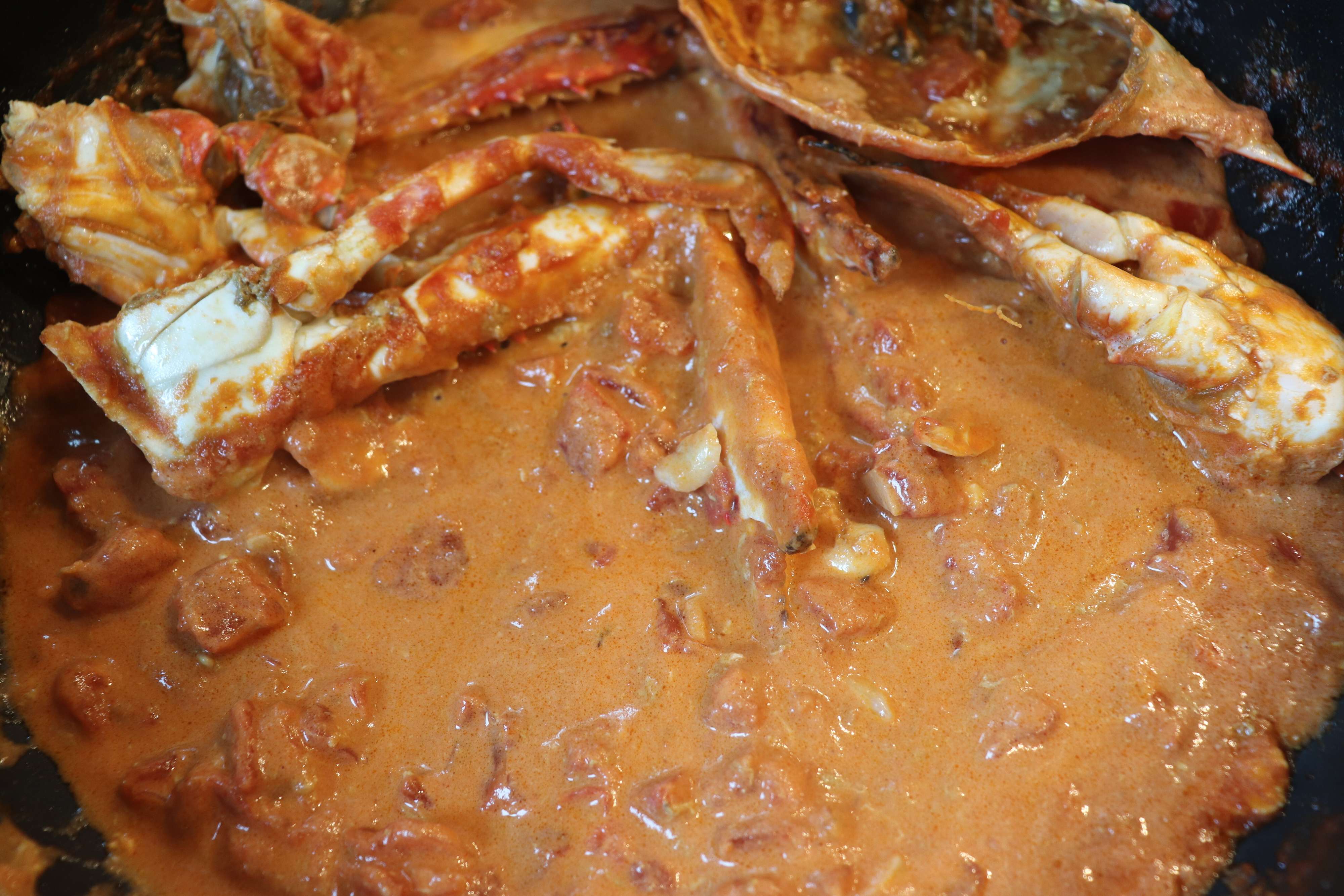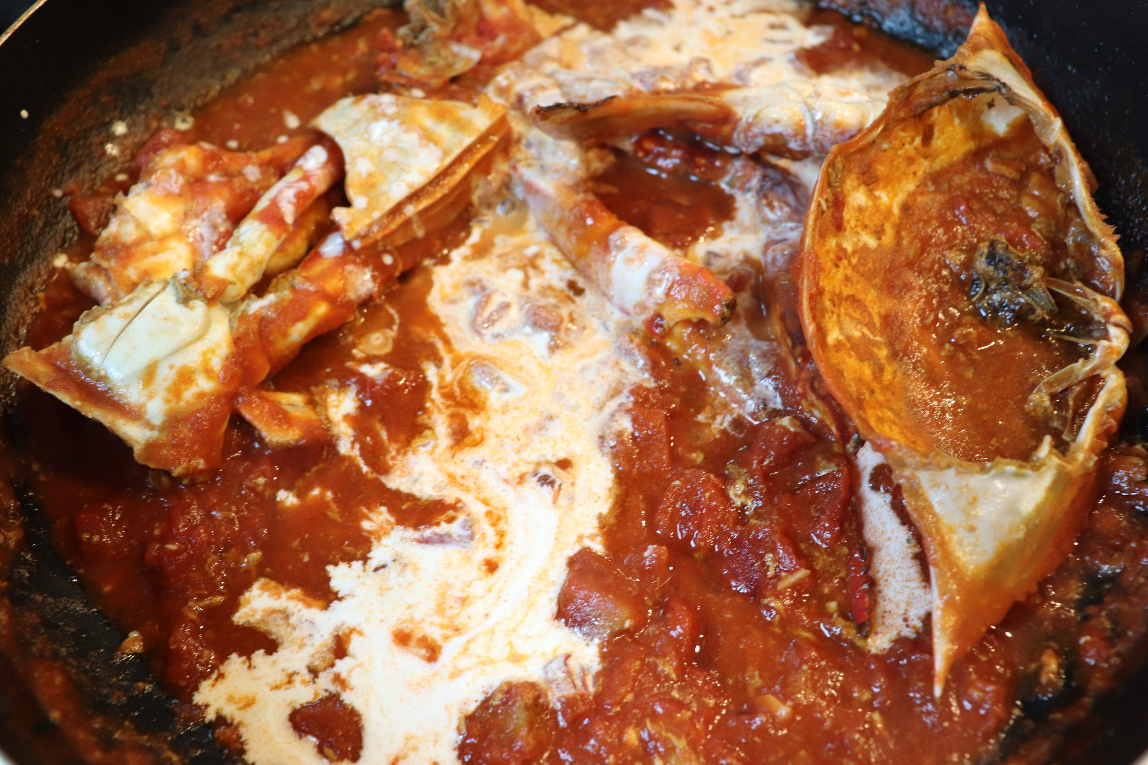 3.火を強め、渡り蟹を入れて、炒める。