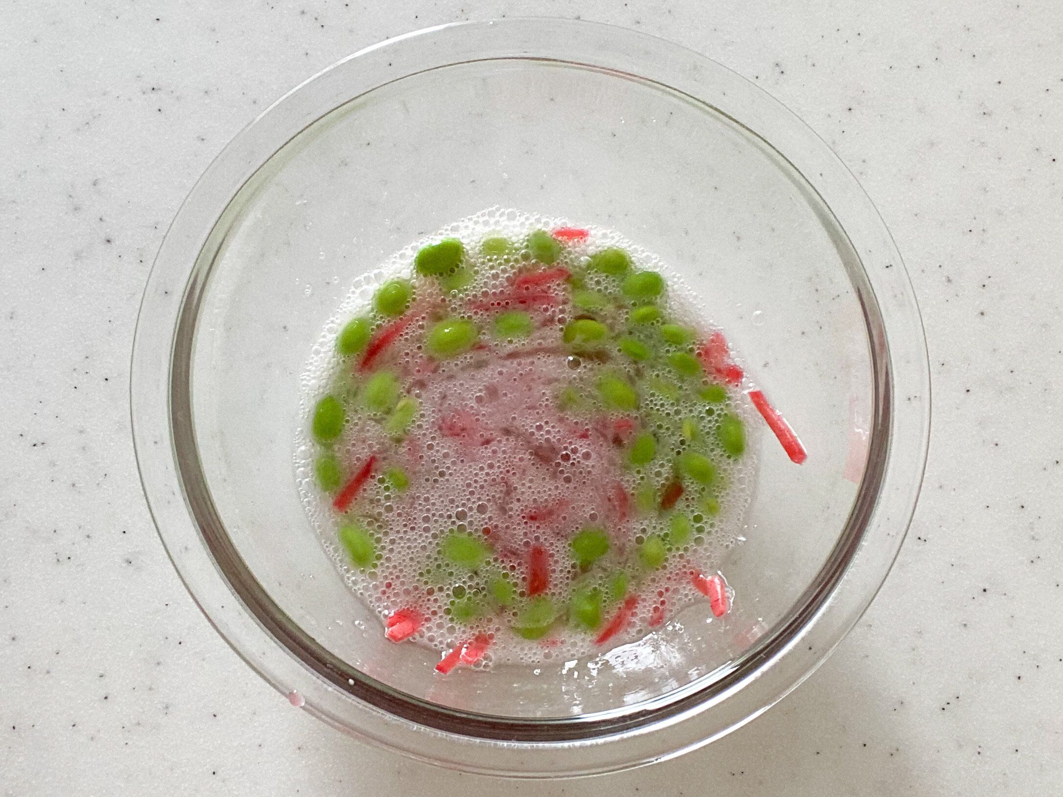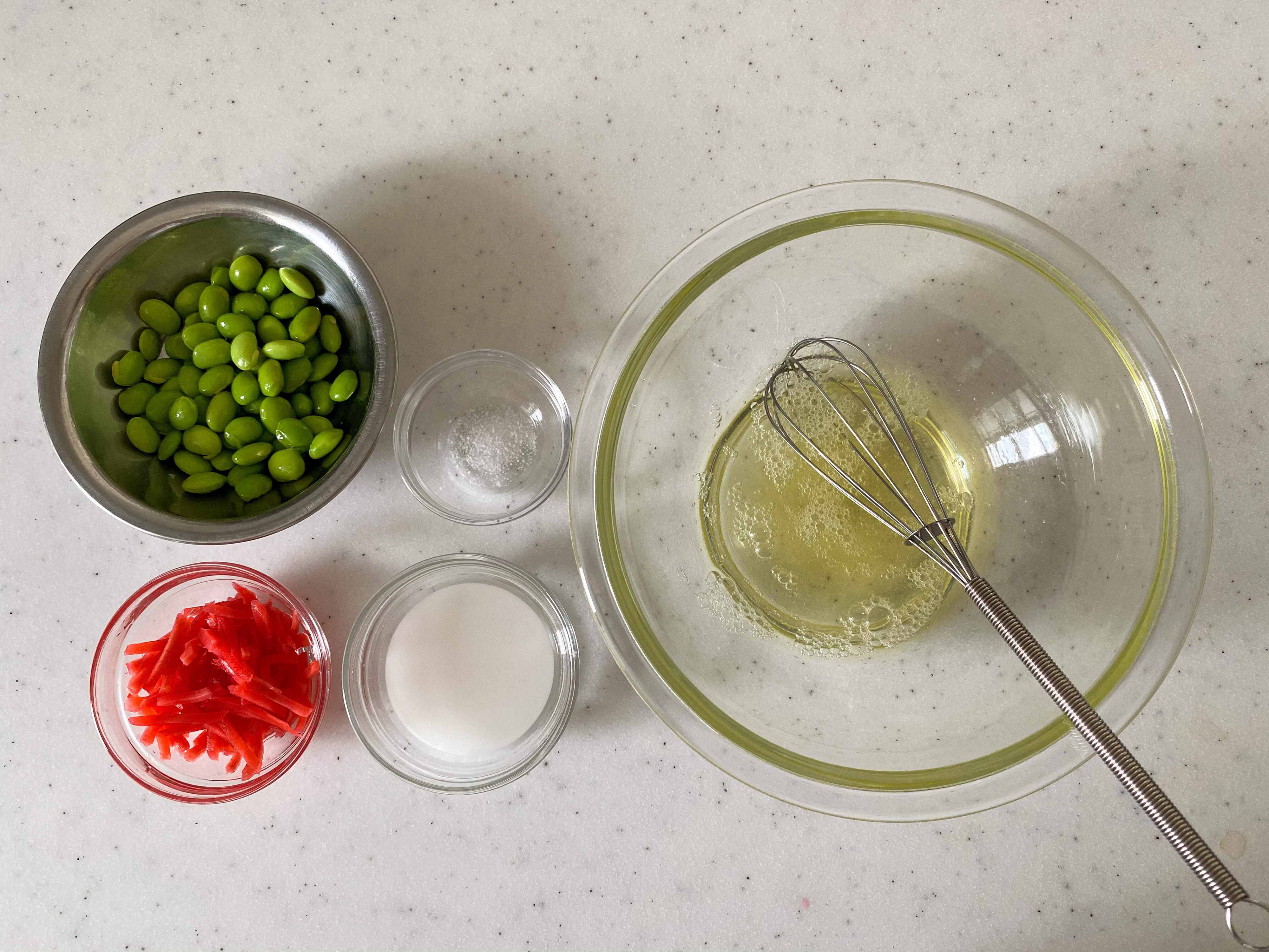 (1)卵白はボウルに入れて溶きほぐし、水溶き片栗粉と塩を加えて良く混ぜる。最後に枝豆、紅生姜を加えてさっと混ぜる。