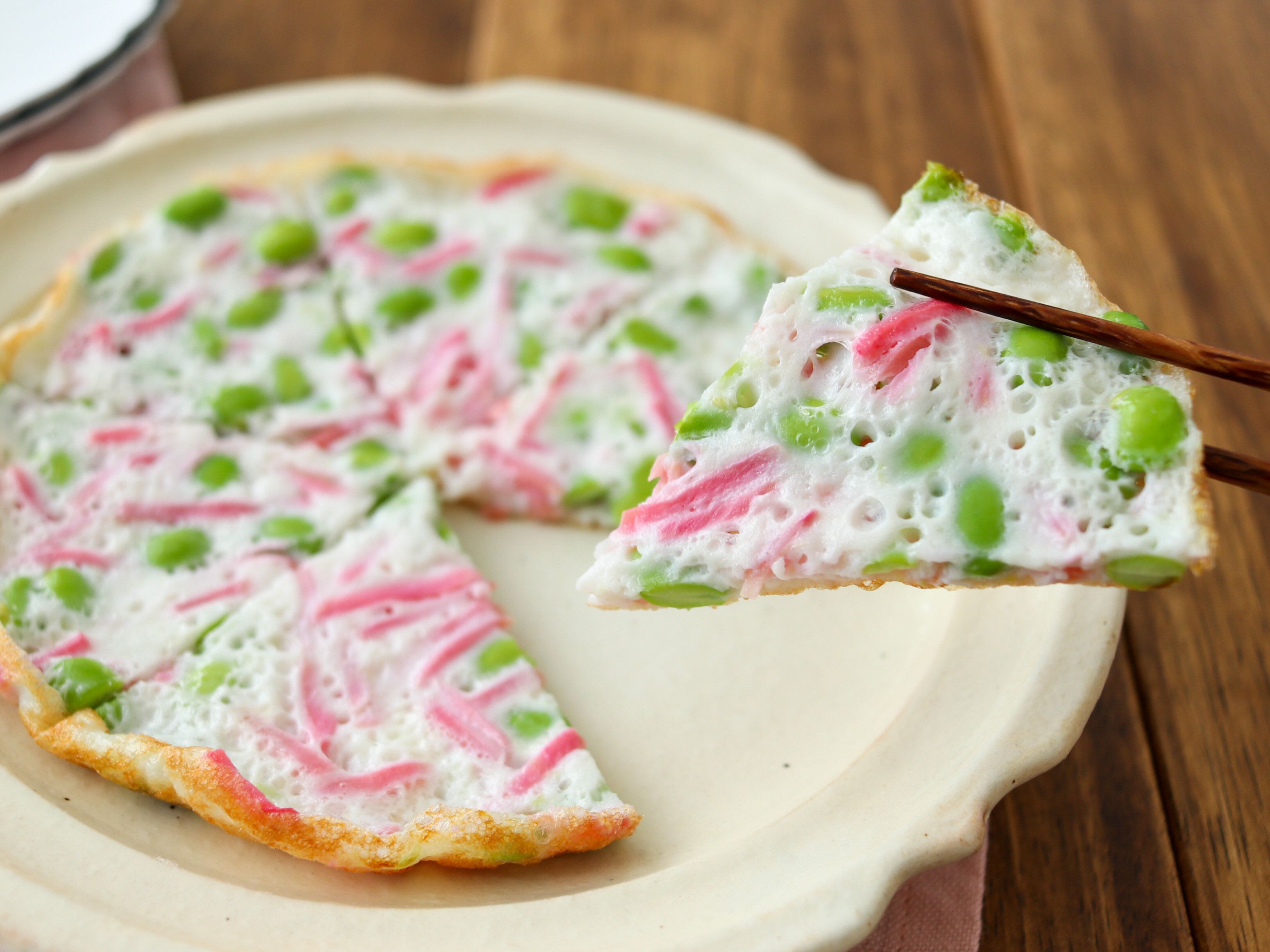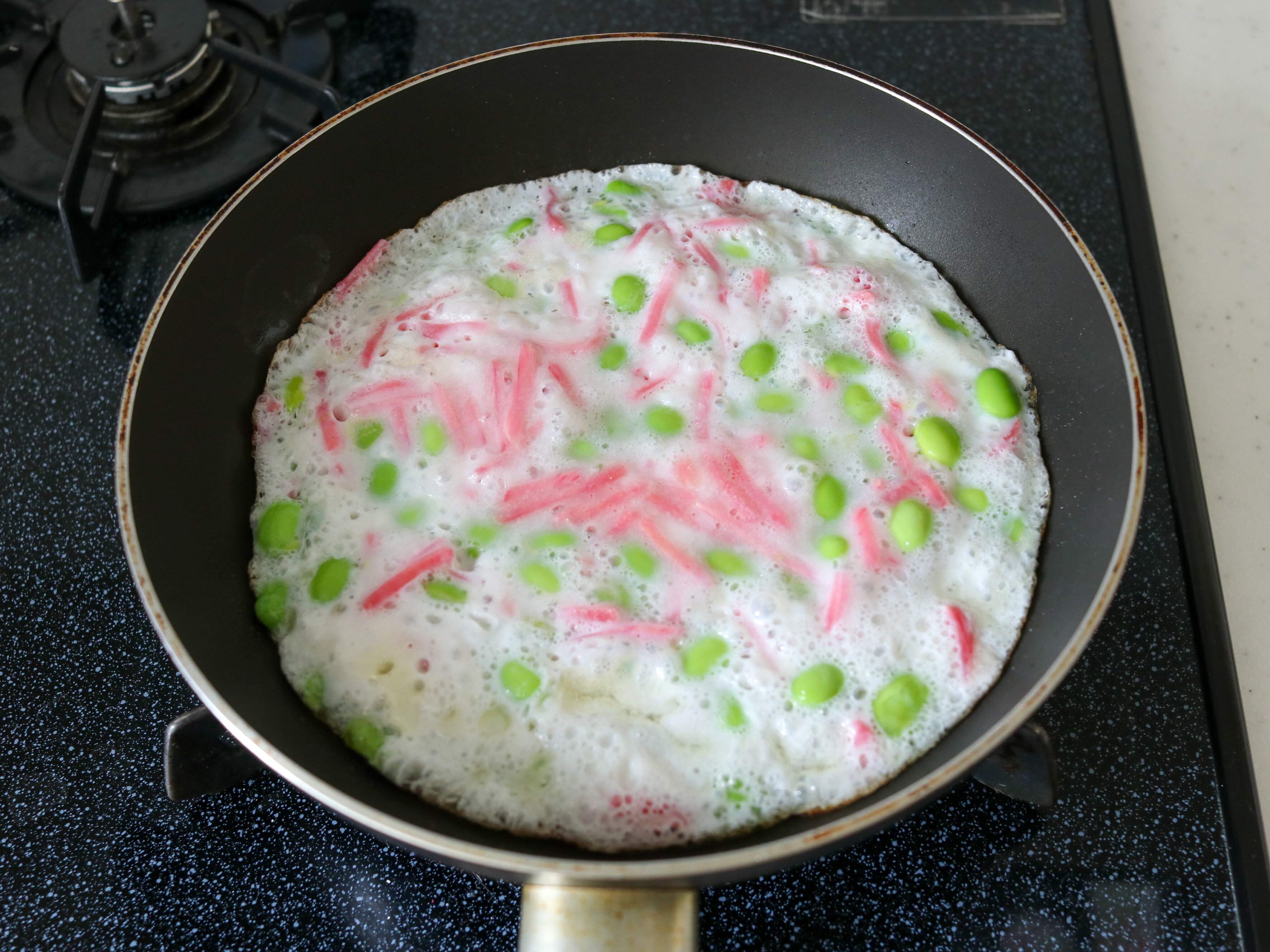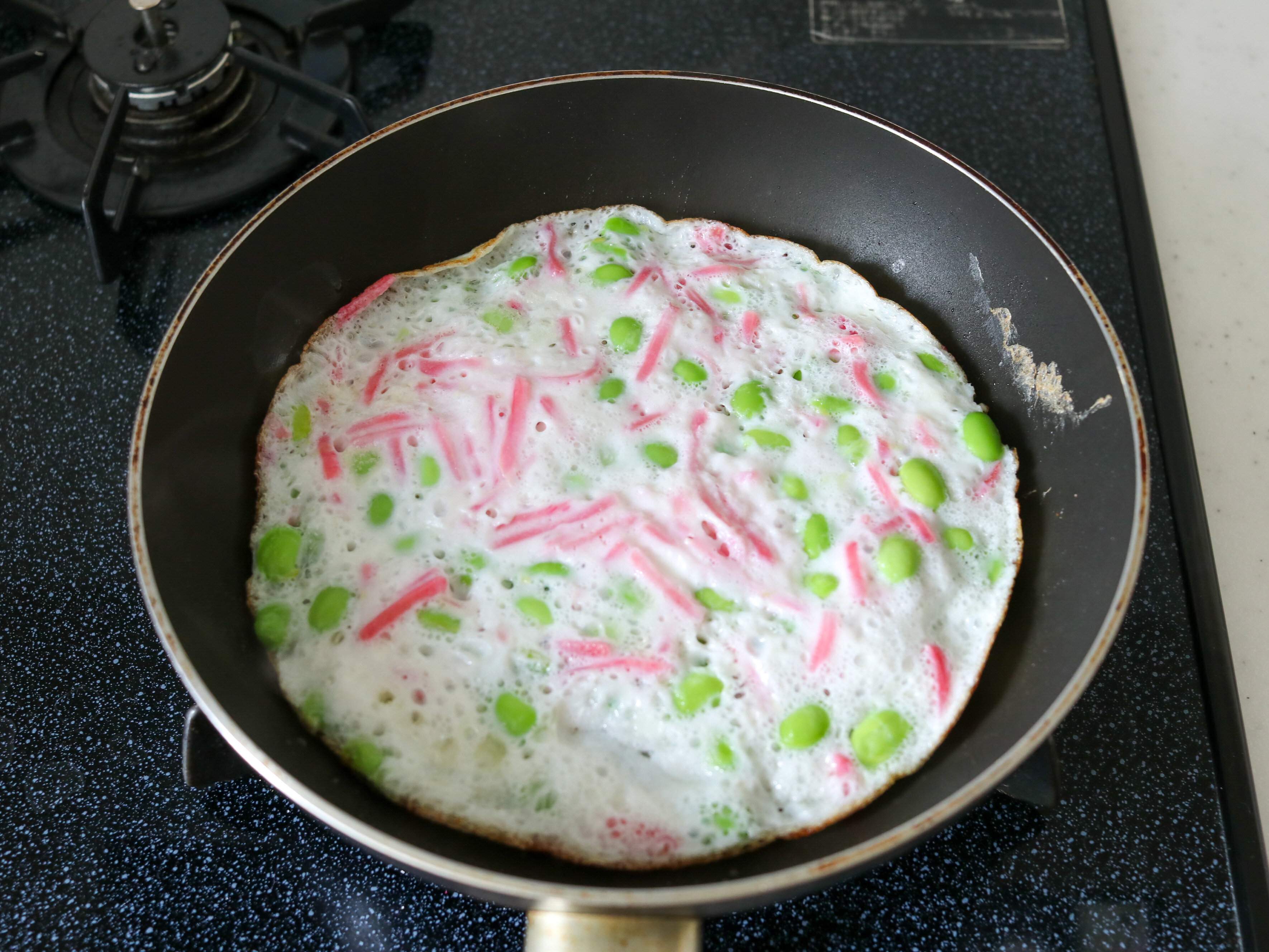 (2)20cmフライパンに米油を熱し、(1)を底一面に流し入れる。蓋をして中弱火で2分半蒸し焼きにしたら一度蓋を開け、表面が固まっているかどうか、底面が焼けているかを確認する。