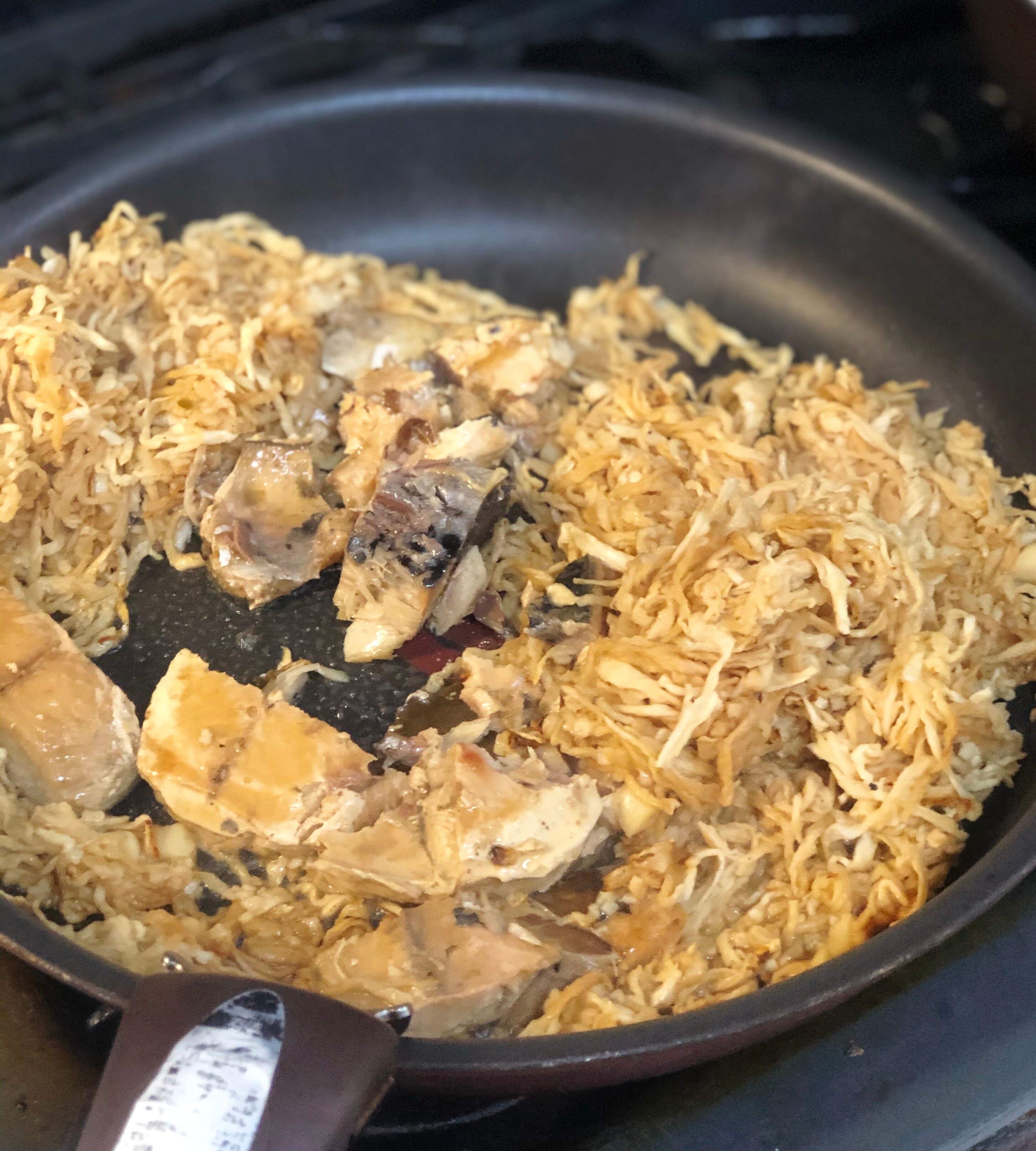 (5)鯖缶を缶ごと入れてさらに炒めて馴染ませます。