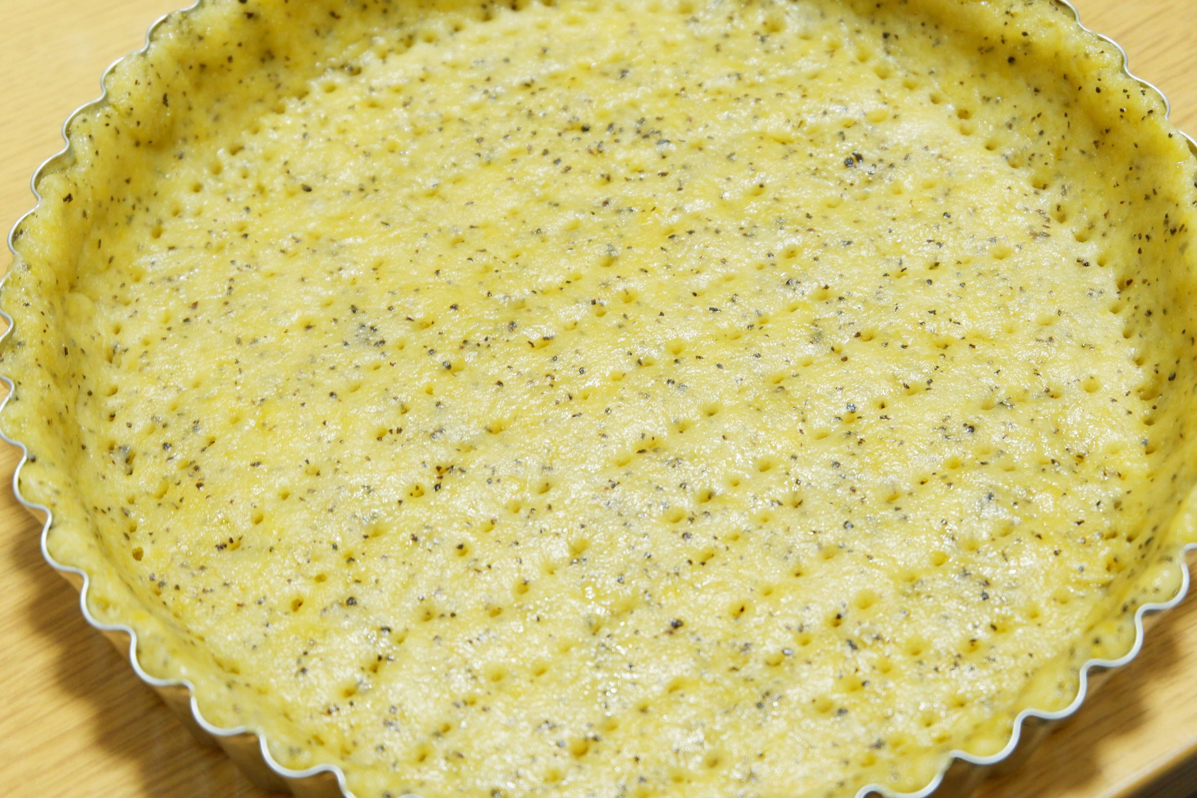 3.打ち粉(分量外)をし、麺棒で均等の厚さにのばし、油を塗ったタルト型にはめる。生地全体にフォークで穴を開け、170℃のオーブンで15分焼く。