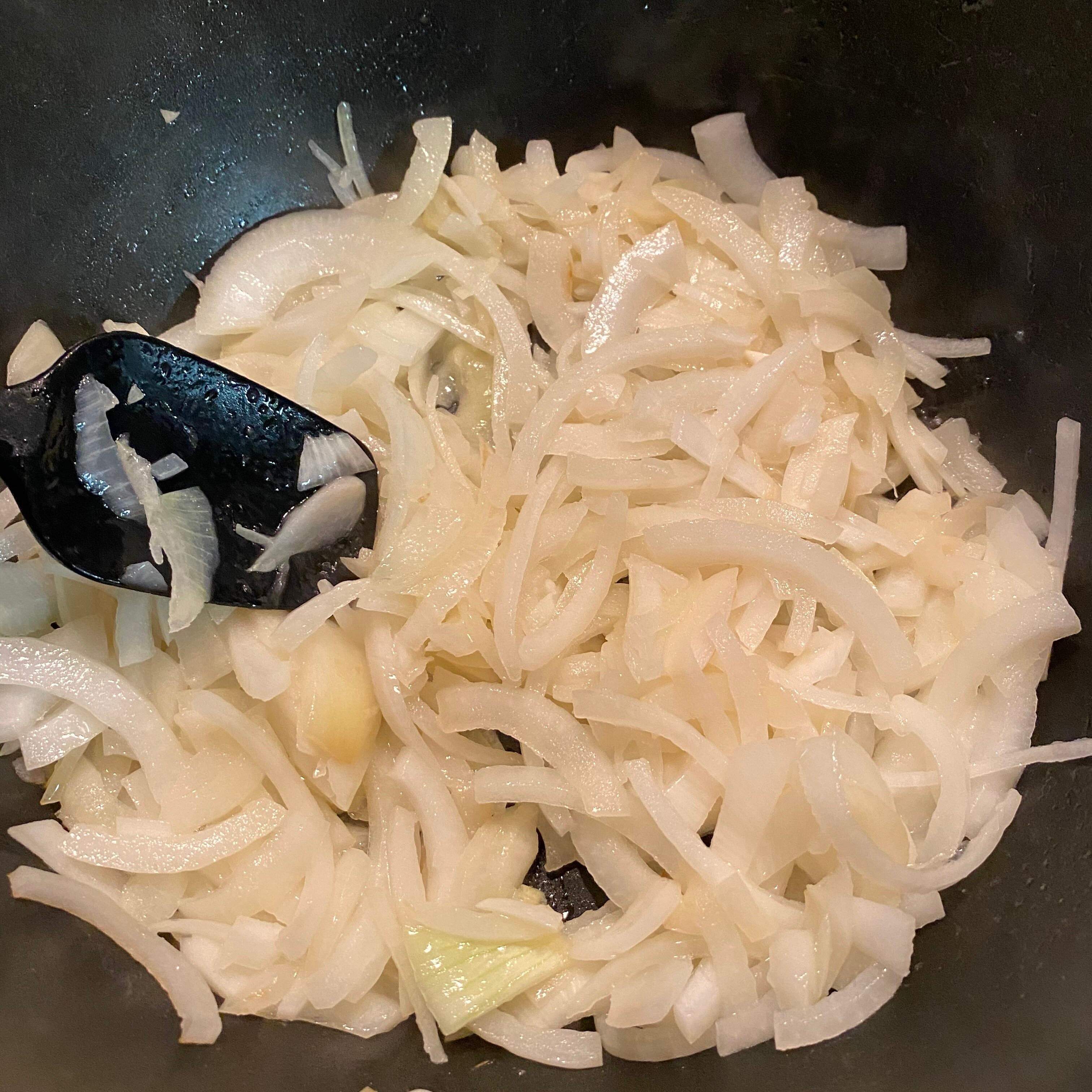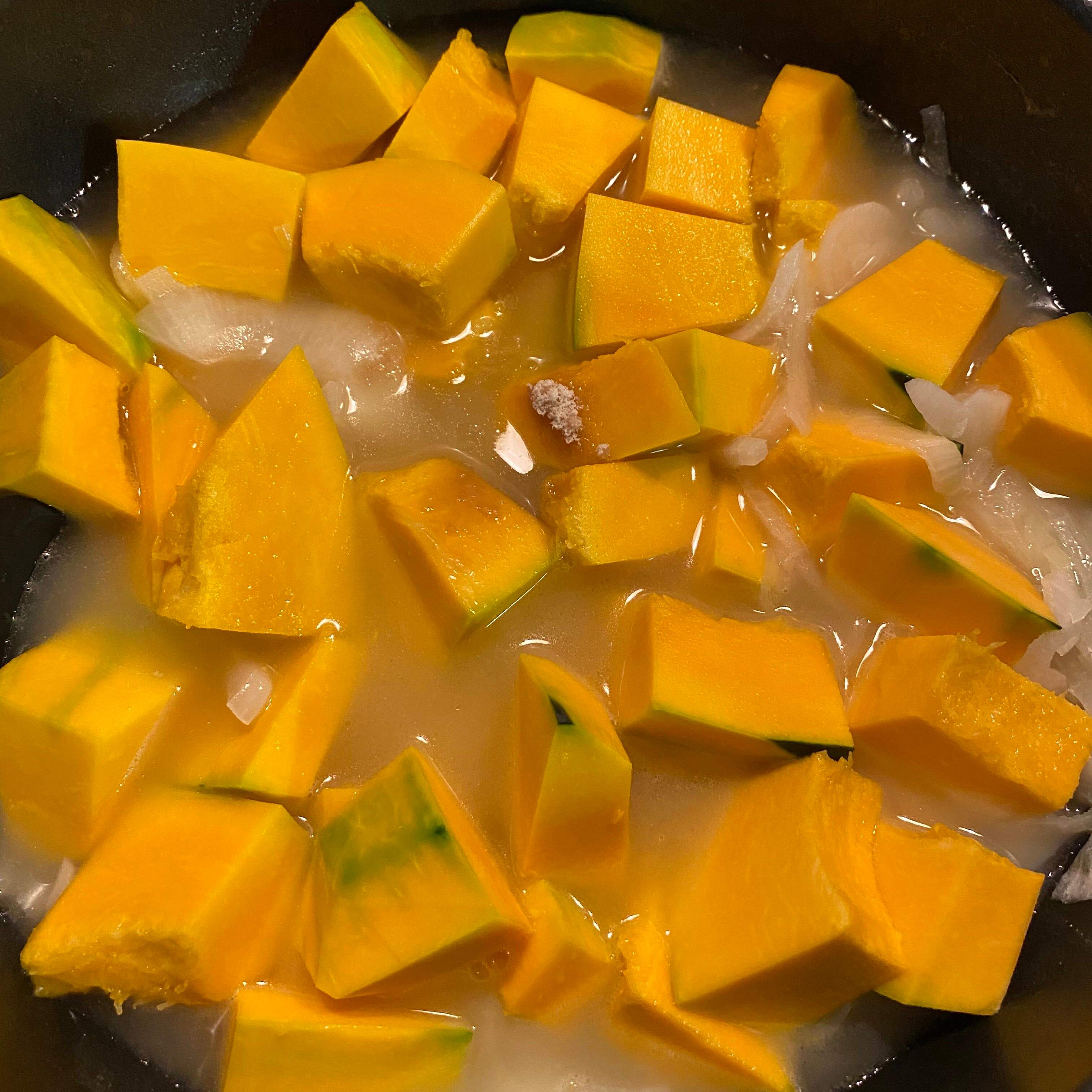 (2)玉ねぎがしんなりしてきたらかぼちゃと水、砂糖、塩を入れてかぼちゃが柔らかくなるまで煮る