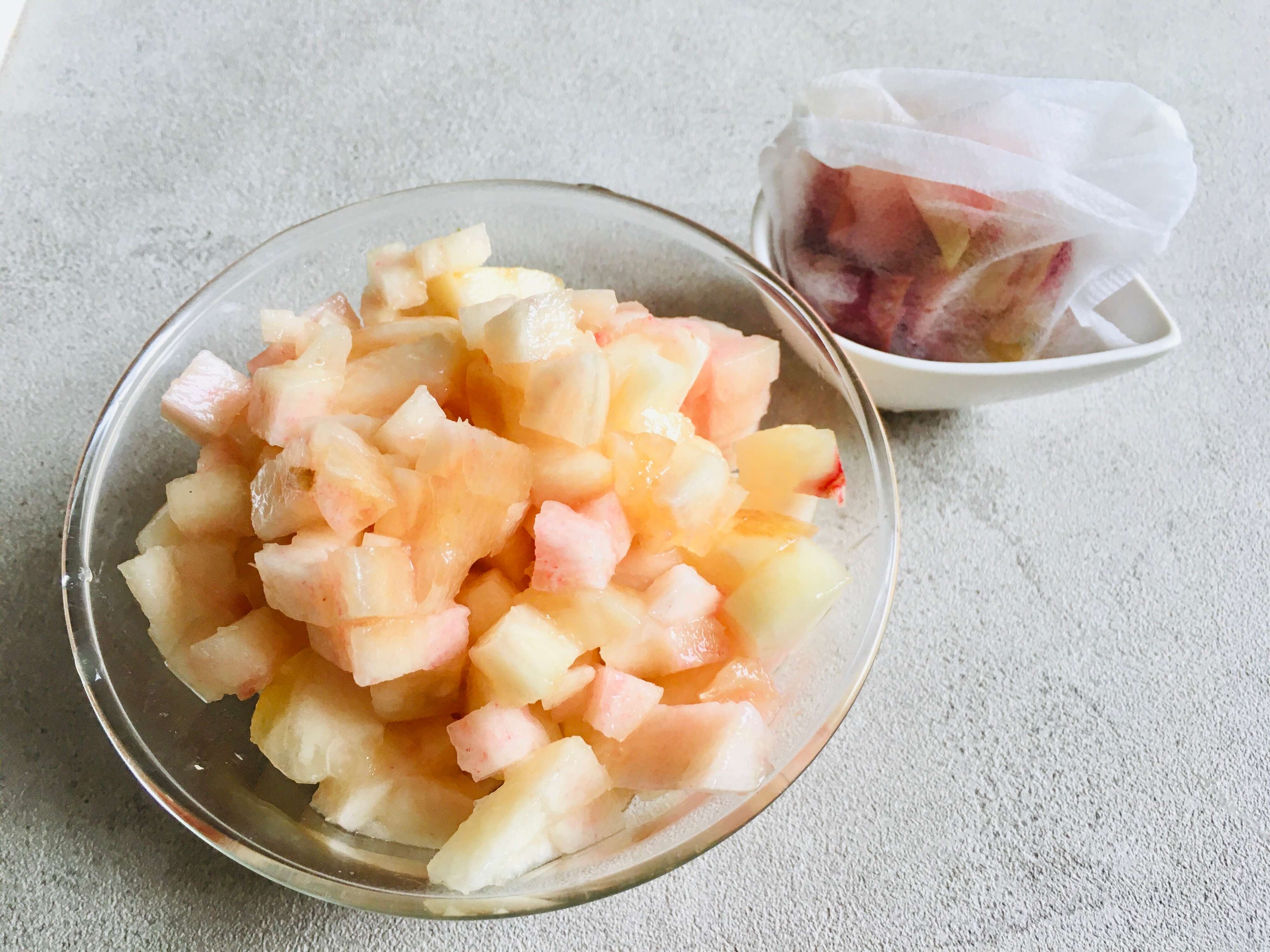 1.桃は皮を剥き、小さめの角切りにする。皮はお茶パックに入れる。