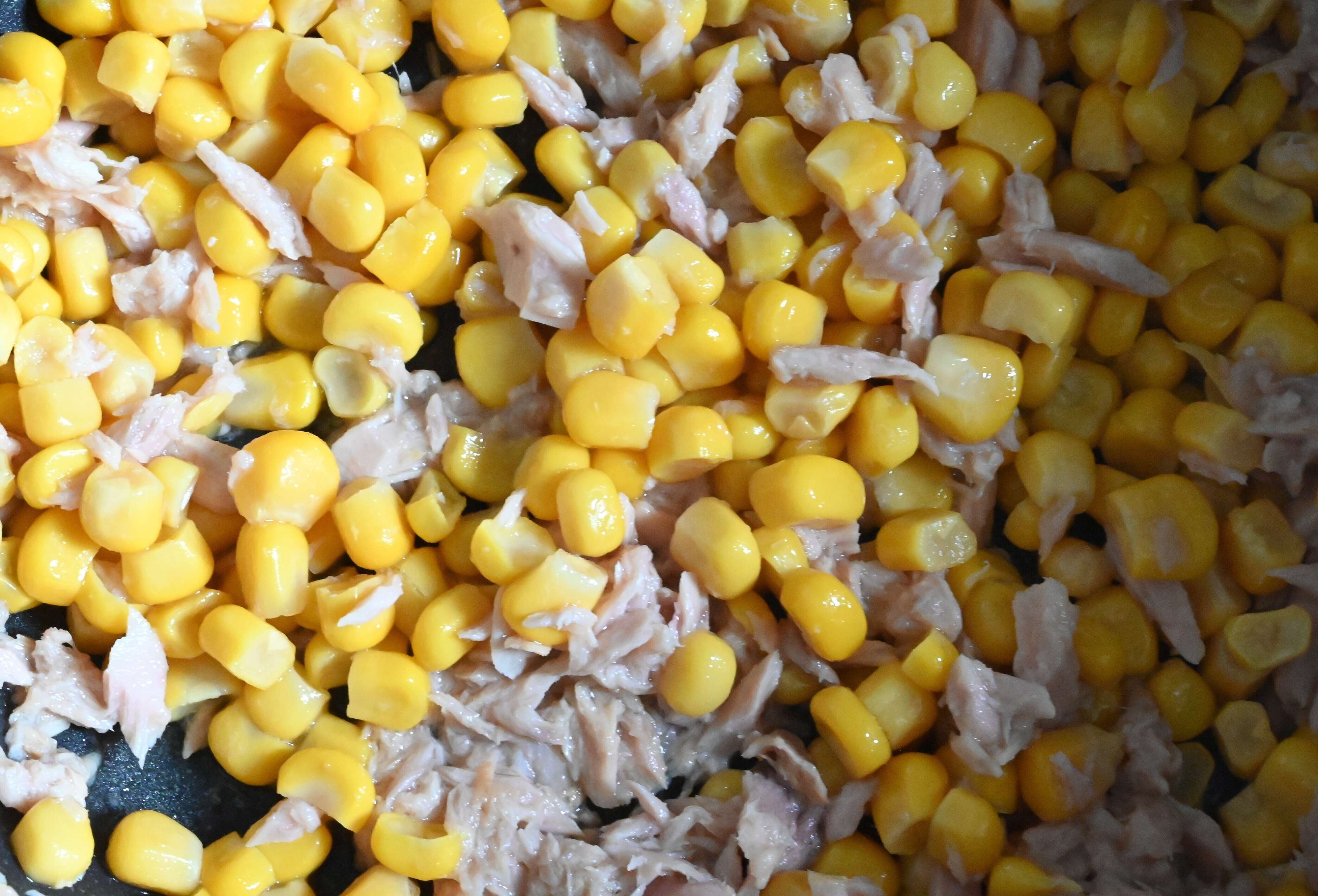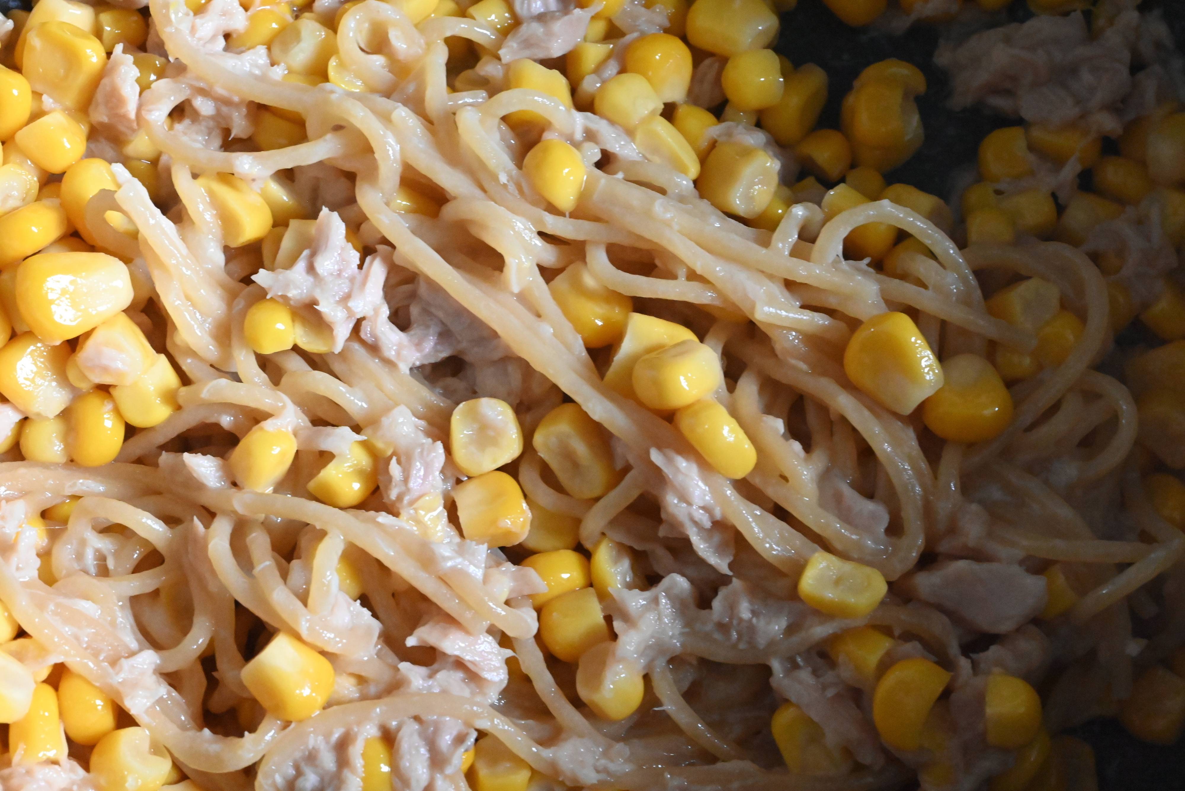 (2)コーン缶とツナ缶、にんにくチューブを水気がなくなるまで中火で炒める。