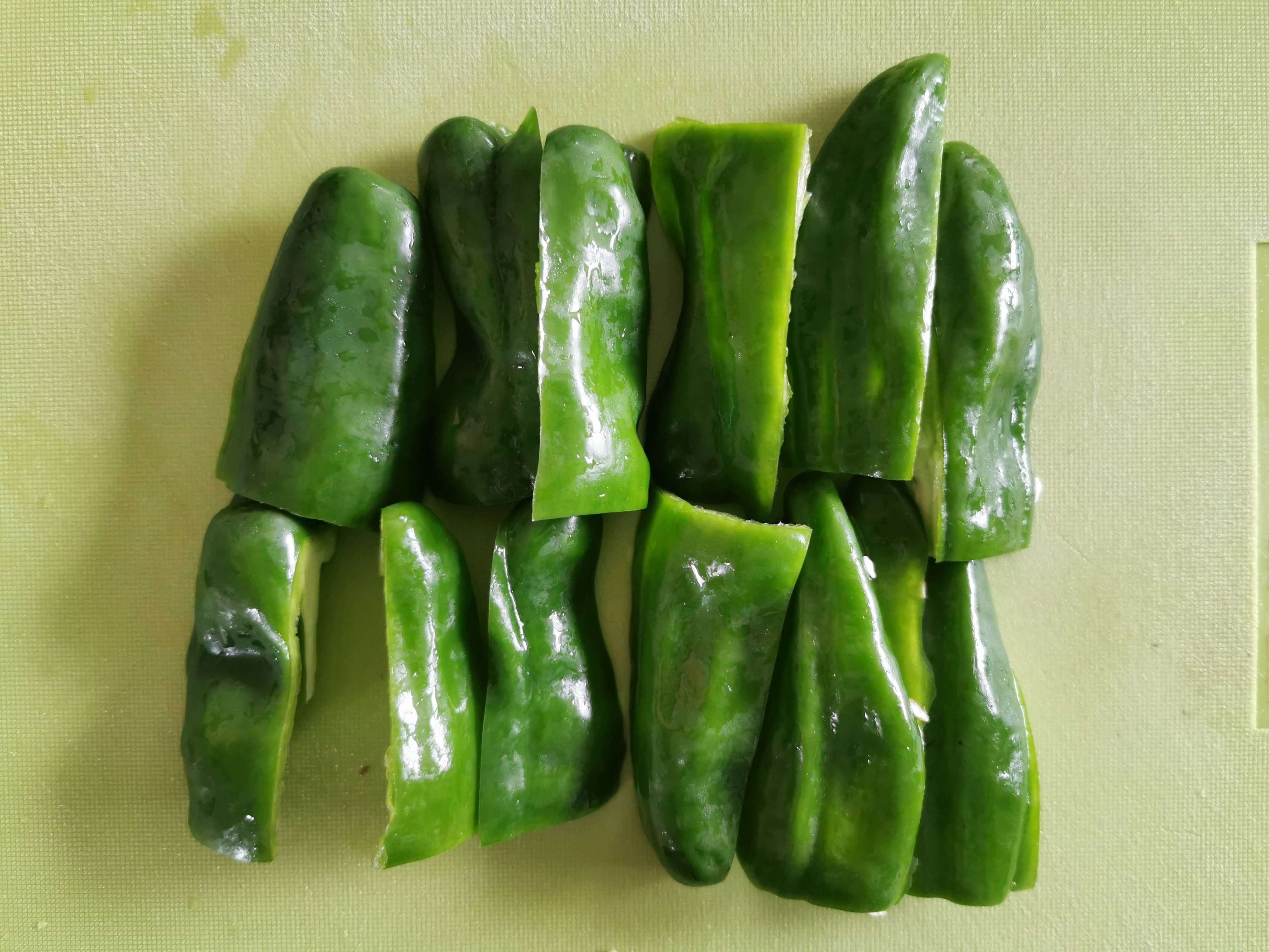 (1)ピーマンはヘタとワタをとり、4等分に切る。