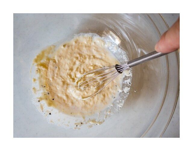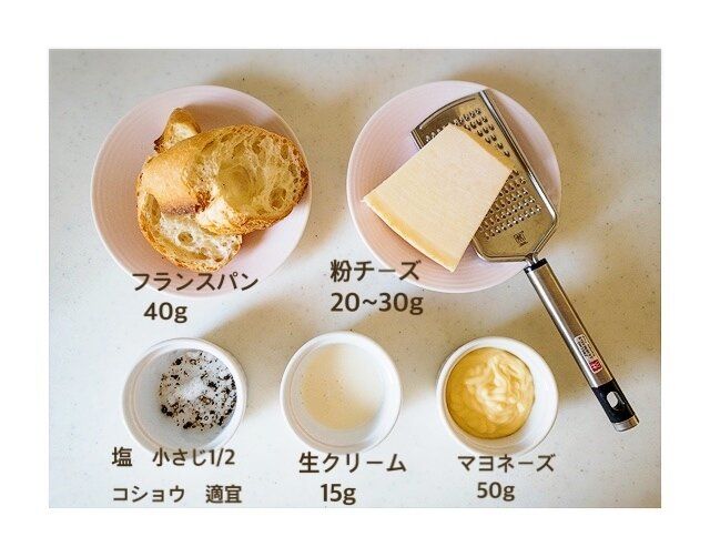 にんにくの香りを移したボールにマヨネーズ、粉チーズ(チーズをすりおろす)、生クリーム塩、こしょうを良く混ぜる。