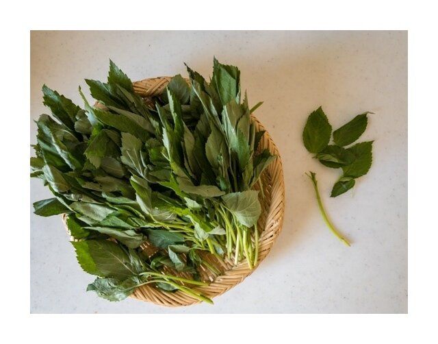 モロヘイヤの葉のみ使うので、茎から葉を取る。
