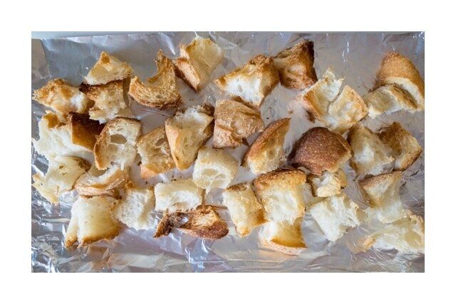 フランスパンは小さな角切りにして、トースターで焼く。