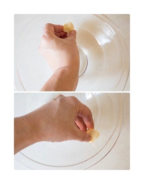 ボールににんにくの切り口を当ててこするようにして香りをうつす。