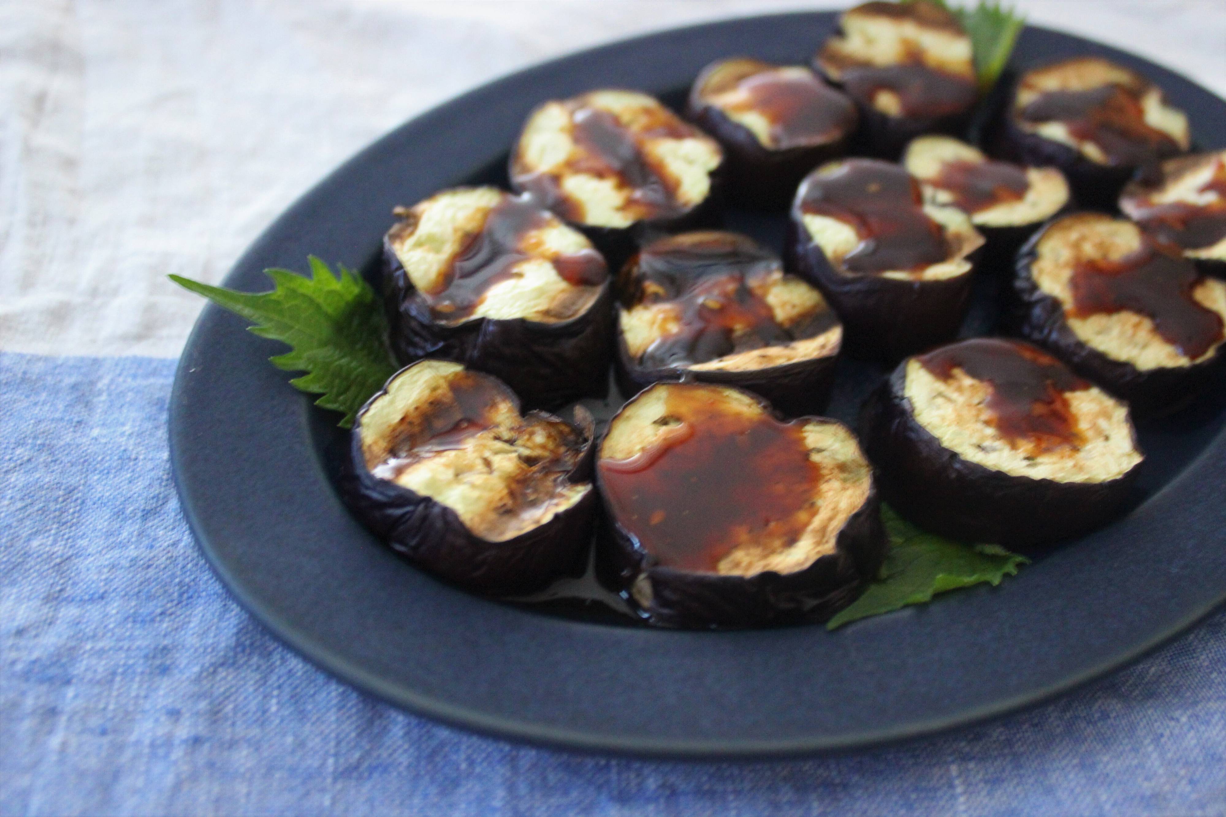 1.なすを輪切りにして魚焼きグリルに並べ、中火でとろりと柔らかくなるまで焼く。