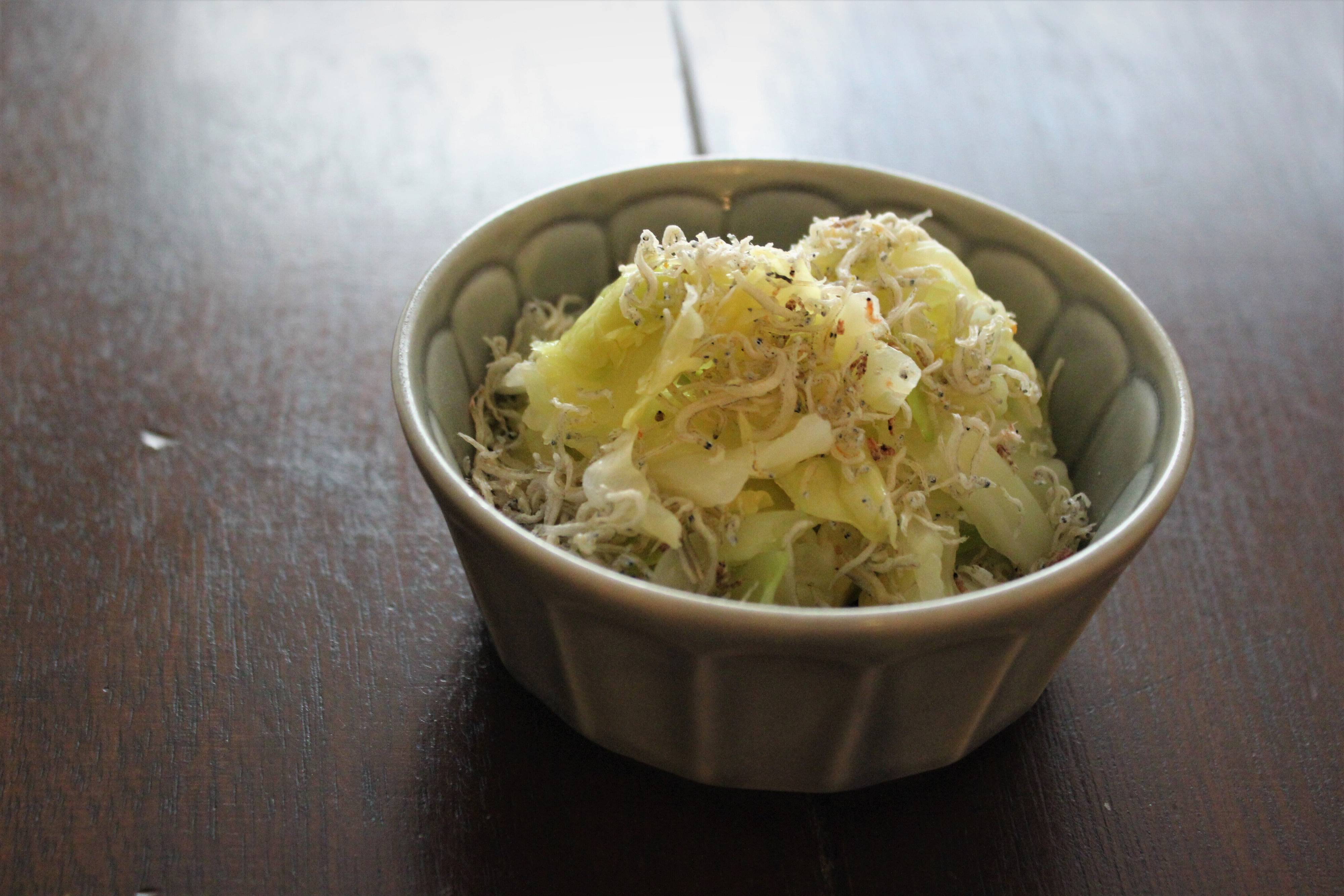 次は、キャベツに冷凍していたしらすを加えて酢の物を。