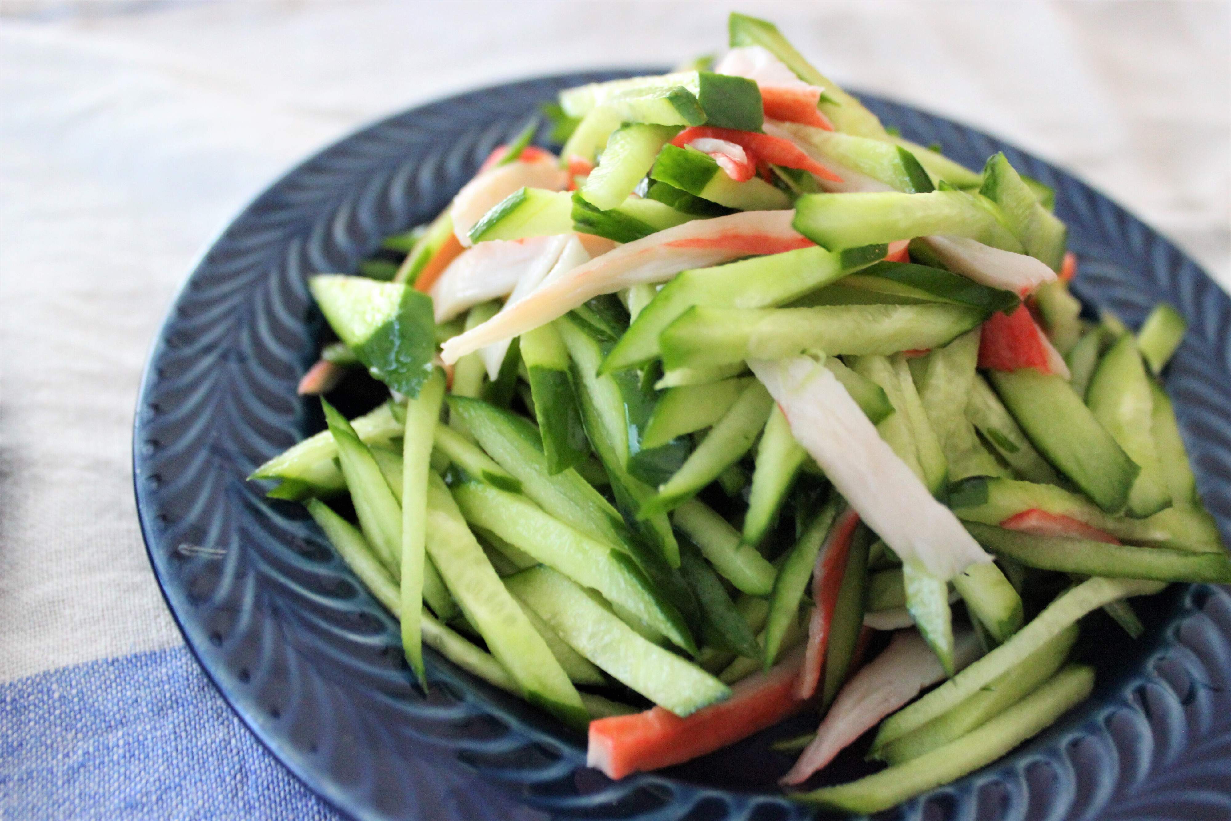 きゅうりは、もうそのまま出せばよかったのですが、逆になぜか2ステップかけたくなってしまい、カニカマと和えて彩りよくしてみました。味付けはポン酢頼み。