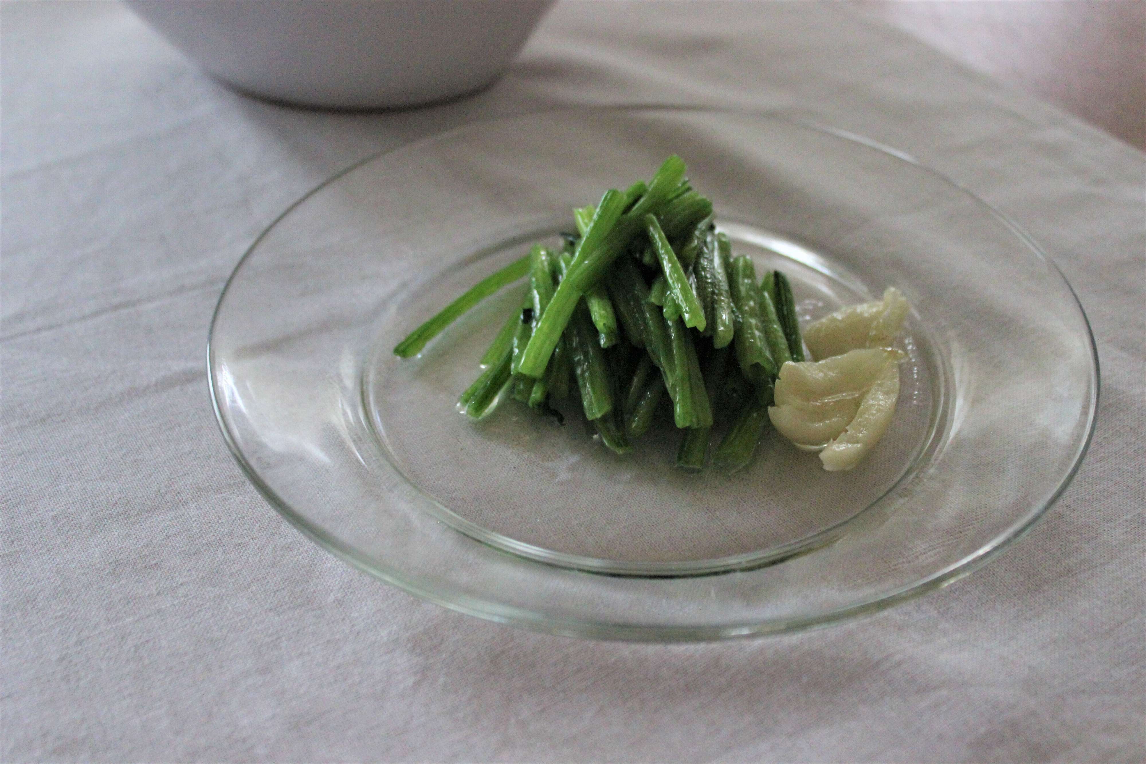 葉物野菜の茎の部分を、茹でるのではなくつぶしたニンニクと一緒に多めのオイルで煮てみると、簡単なのに手抜き感の少ない味になります。