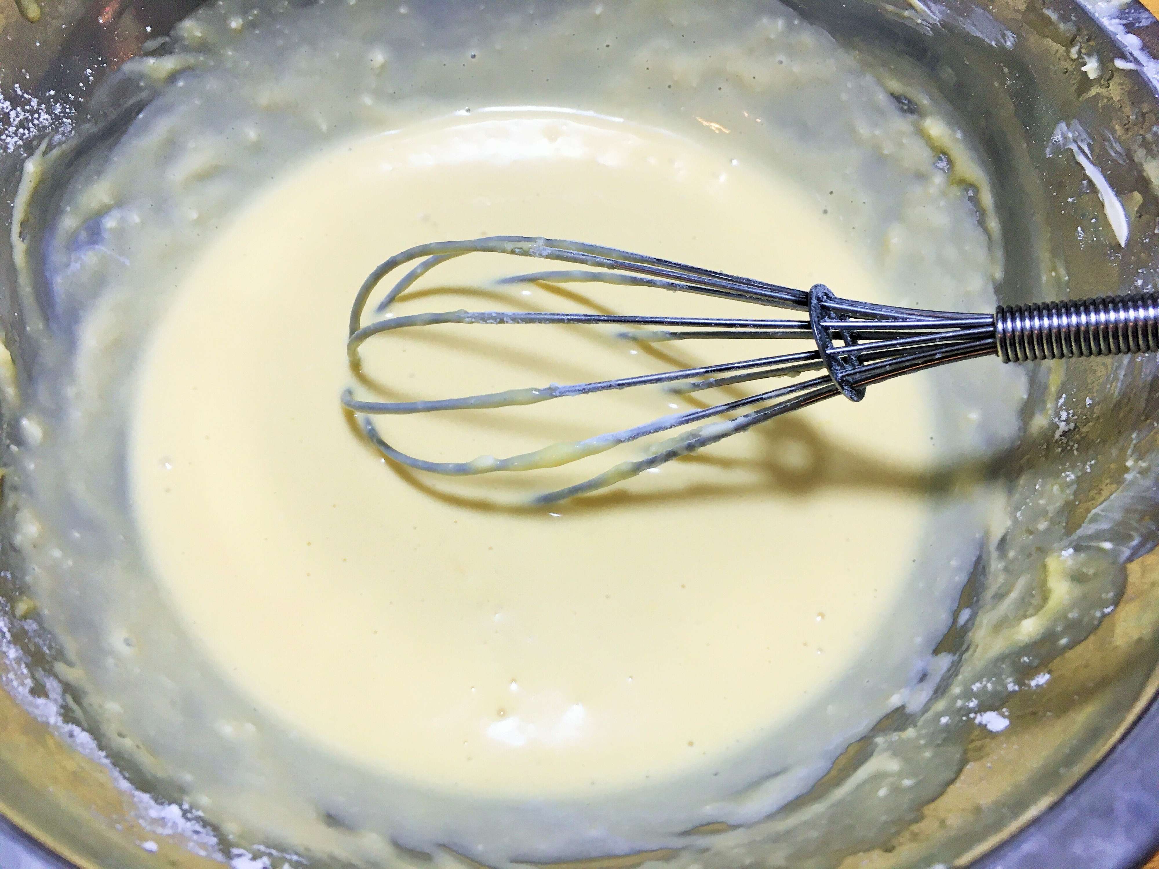 3.卵、塩を加えさらに混ぜ、生クリーム、牛乳を加える。