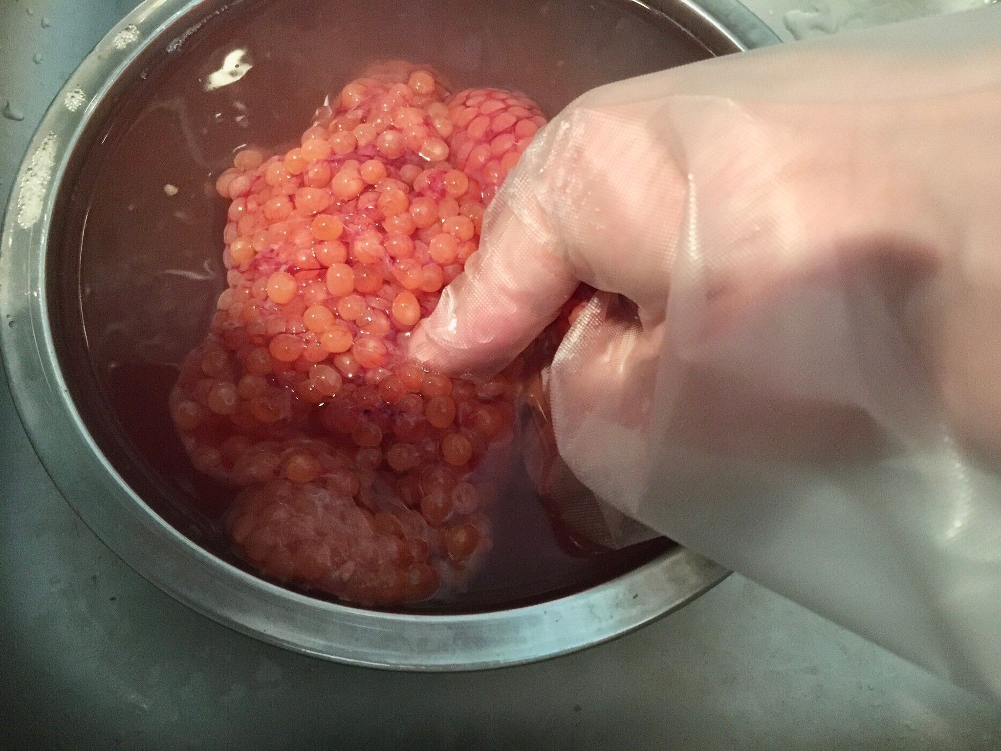 2.40℃くらいの塩水を用意し、生筋子を入れ薄皮から外していく。