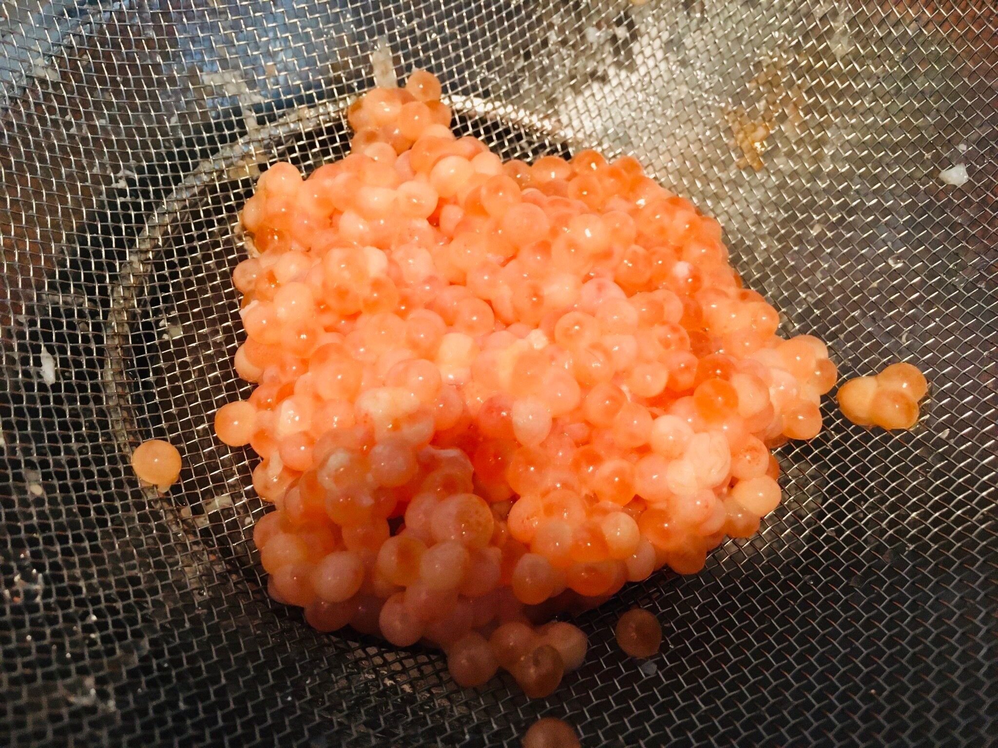 今回の生筋子は1000円ほどだったので、お店で買うよりはちょっとだけ安いかと。