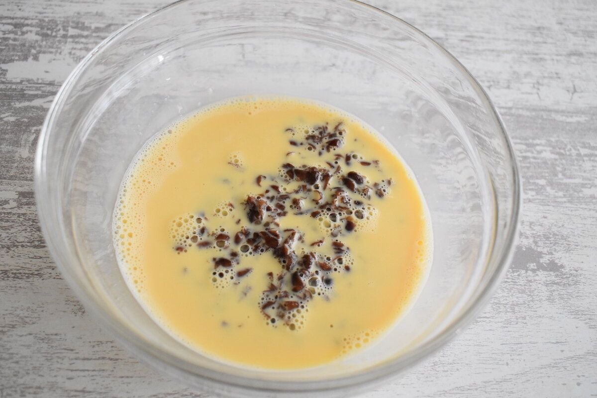 ボウルにたまごを割りいれ溶きほぐし、豆乳(または牛乳、水)を加えよく混ぜ、あんこを加えてざっくり混ぜる。