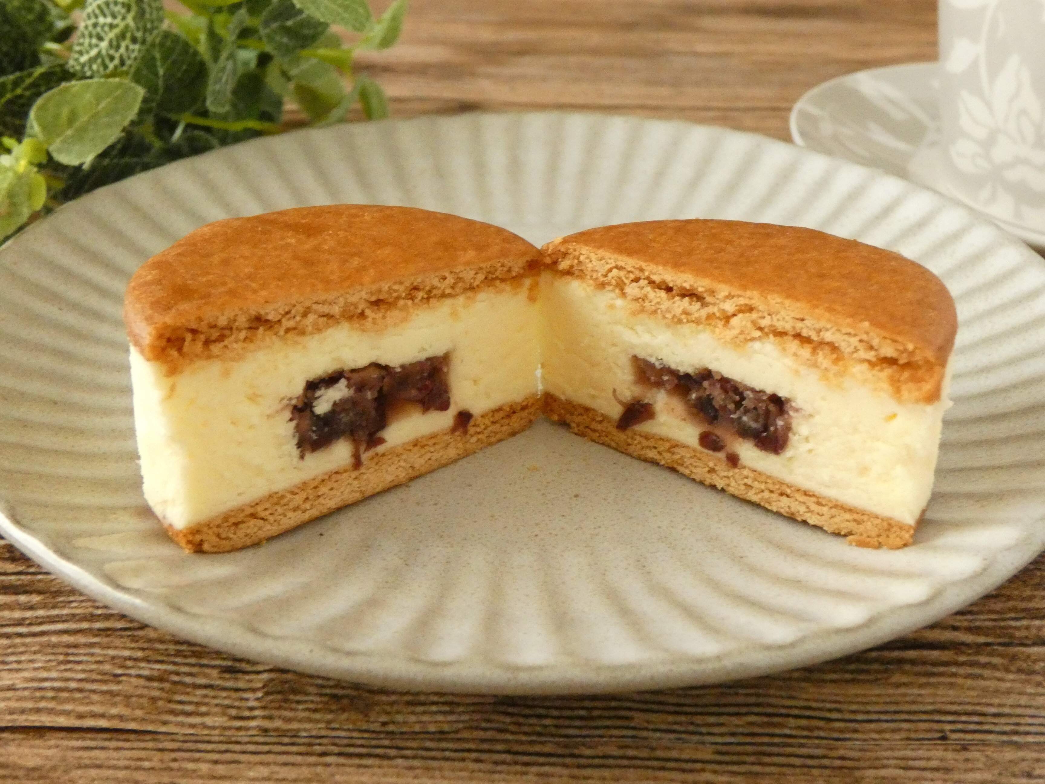 手のひらサイズのスイーツで、こんがりと焼いたビスケットにバタークリームがたっぷり。クリーム中央には粒あんが入っています。