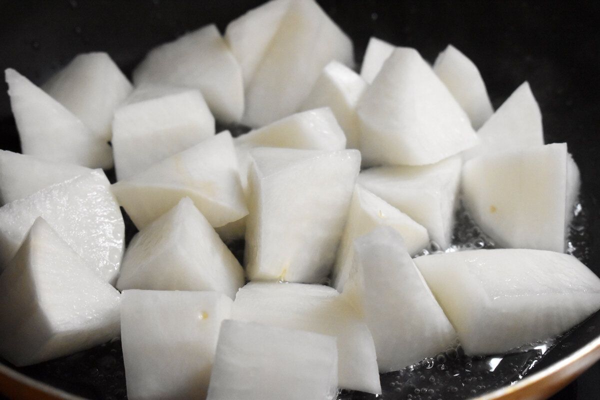 フライパンにサラダ油を熱し、大根を炒める。