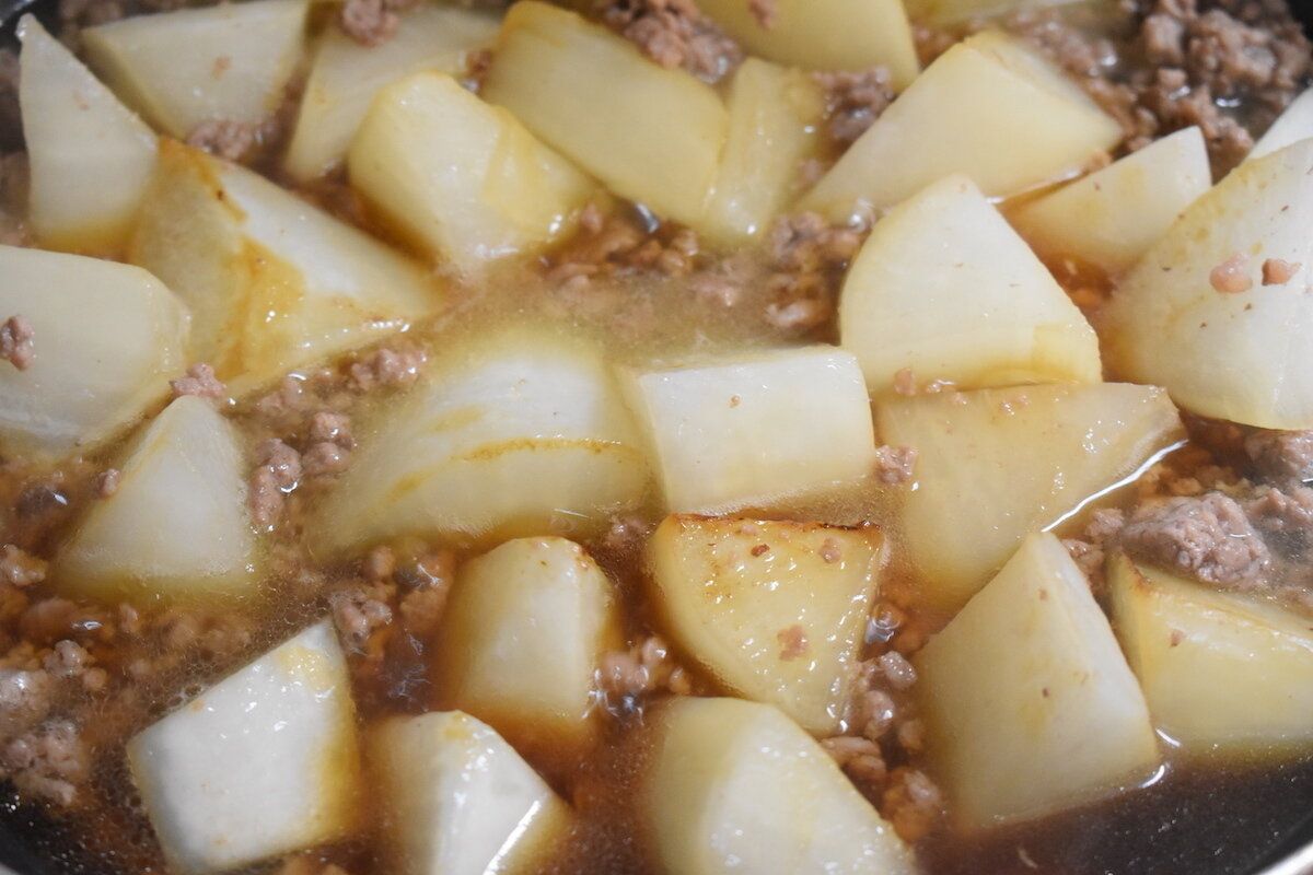 めんつゆを加え、しょうが(もしあれば)を加え、フタ(またはアルミホイルで覆う)をして、『弱火』で煮る。もし、途中、煮汁が少なくなってしまい、大根がまだ固い場合は、めんつゆ(煮汁)を継ぎ足しても良い。