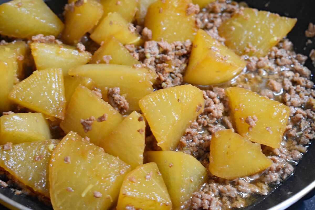 ときどき菜ばしで転がしながら、大根にスッと箸が刺さるほどやわらかくなれば完成。
