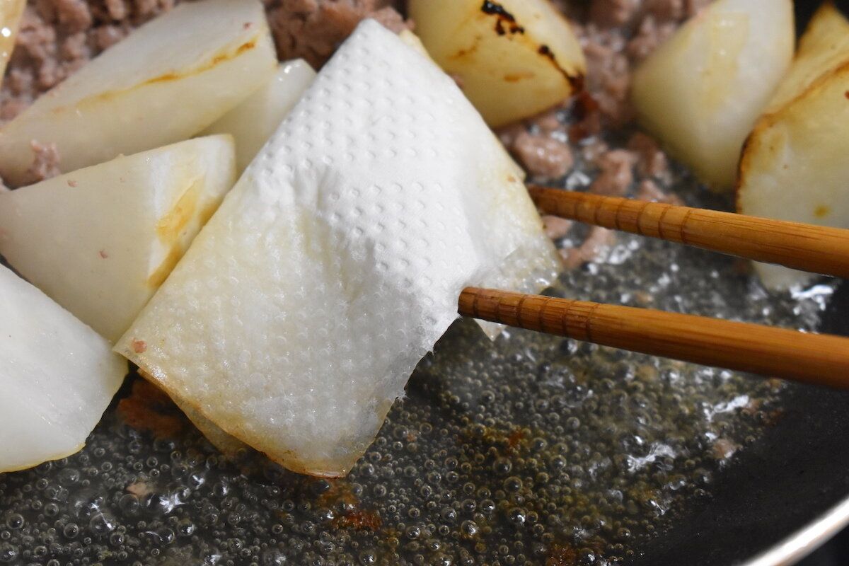 ひき肉は火の通りが早いのでさっと炒めて煮ればふっくら仕上がります。煮汁を加える前に、余分な油をキッチンペーパー(耐熱性のもの)で吸い取ればさっぱり仕上がります。