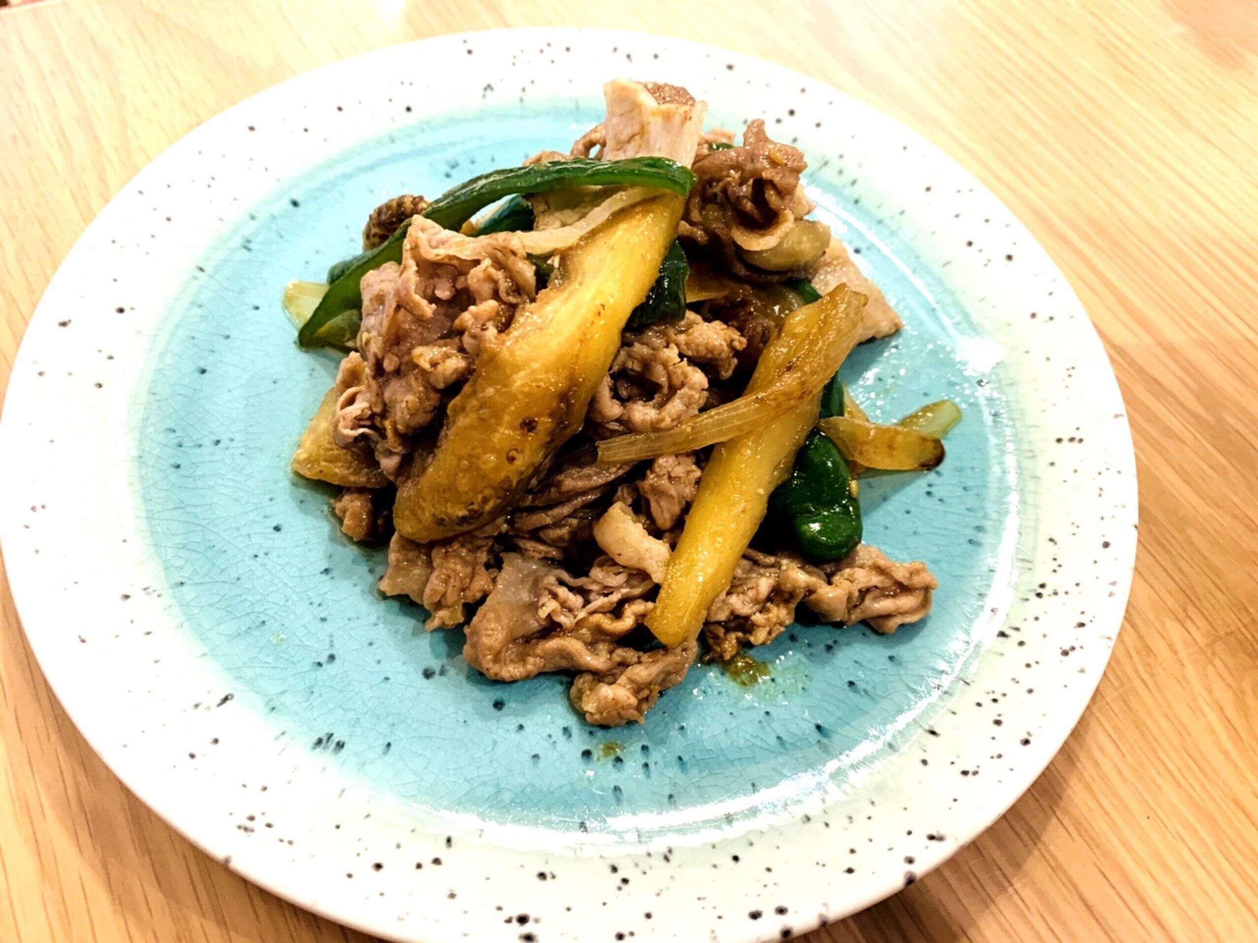 こちらは豚肉に玉ねぎやピーマン、なすなどを入れて炒めたレシピ。おうちにある野菜で手軽につくれます!