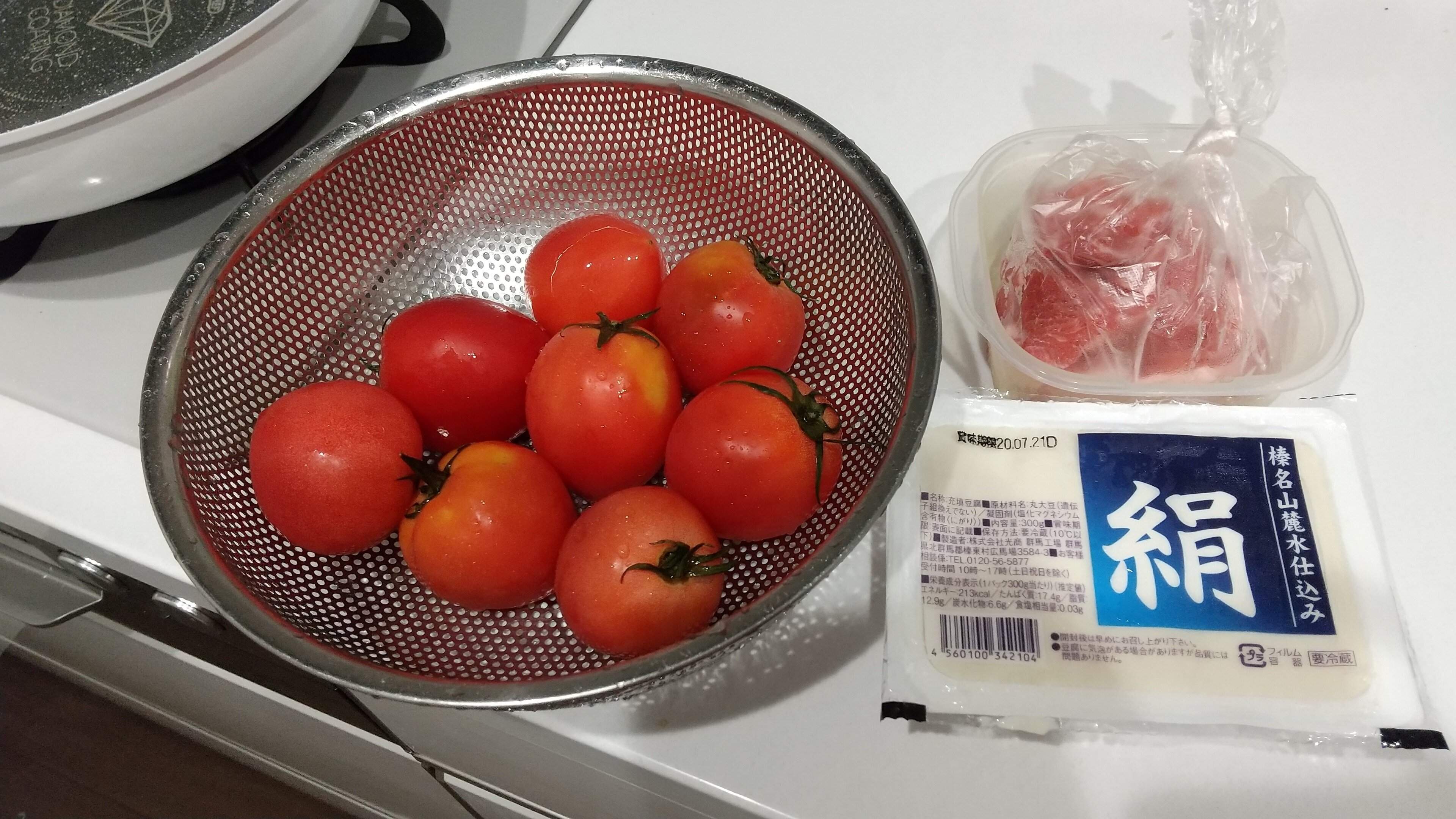 豚肉は、100g100円以下のものを使用。豆腐は1丁30円台、税込でも40円くらい。旬のトマトは8個入りで300円程。ざっくり計算で、400円程で1食分つくることが出来ました。
