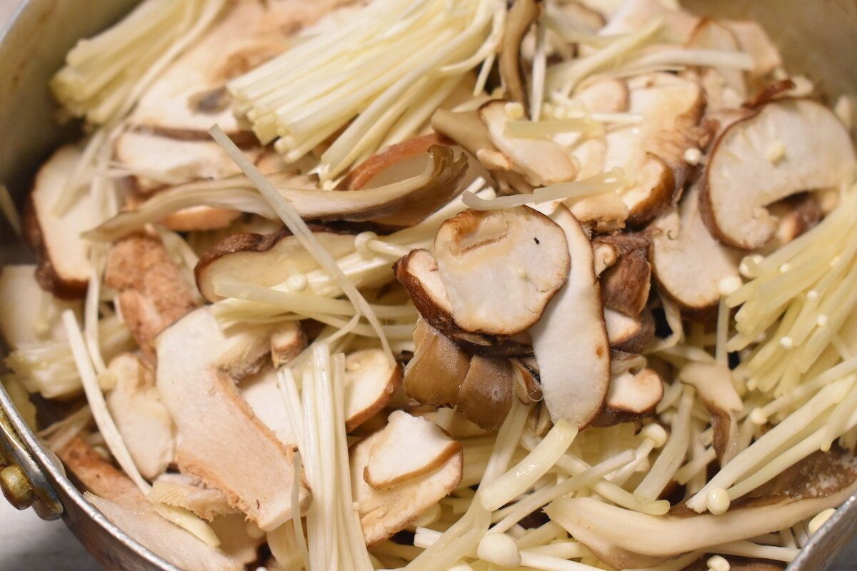 今回使用した、えのきたけ、しいたけ、まいたけ、エリンギなどきのこ類は基本的には洗いません。