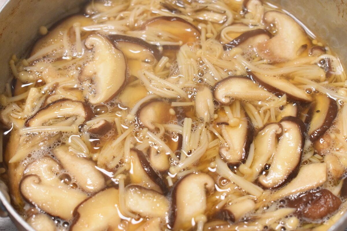 最初にざっくりお伝えすると、きのこ類は食べやすく切って、煮汁で煮るだけ。