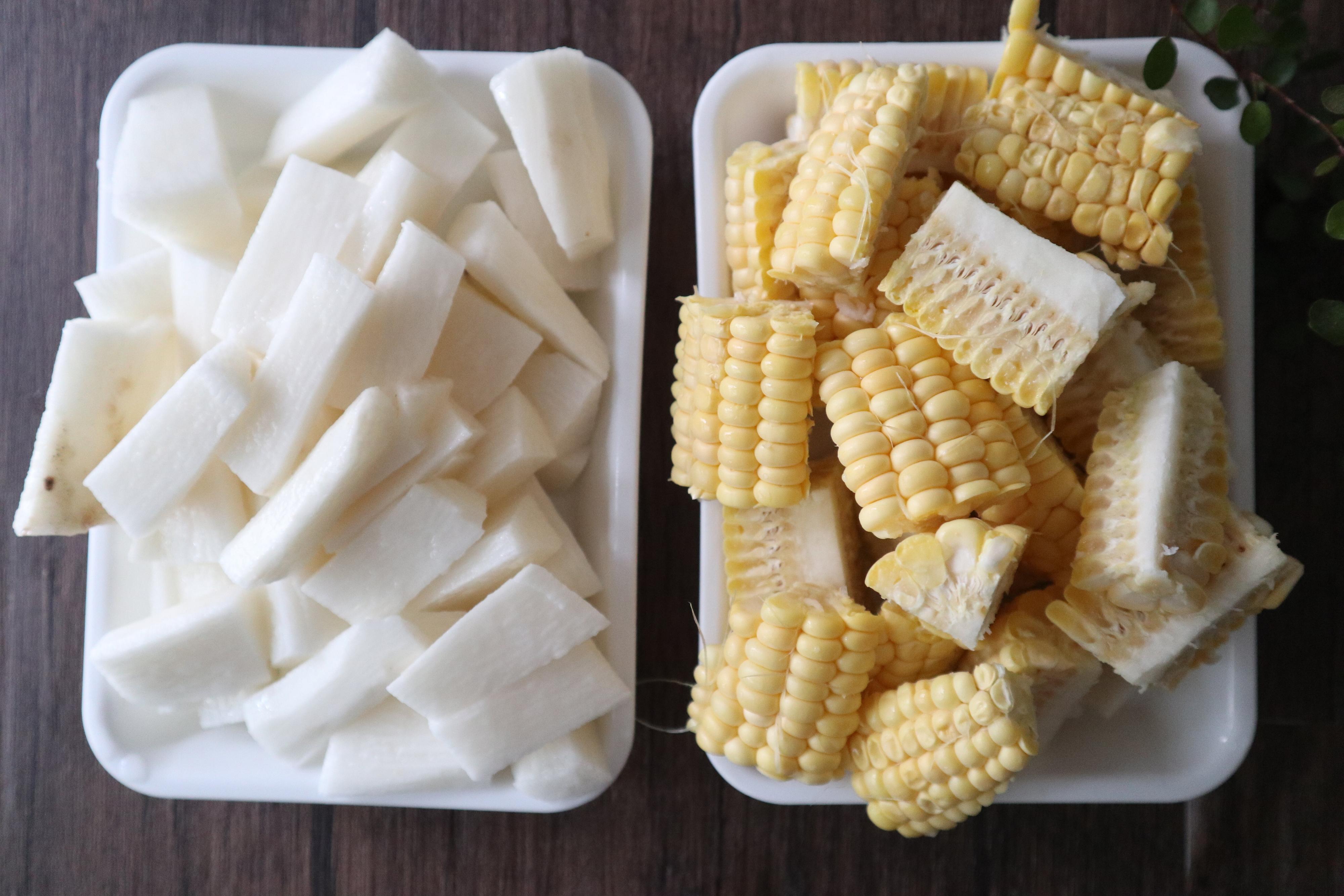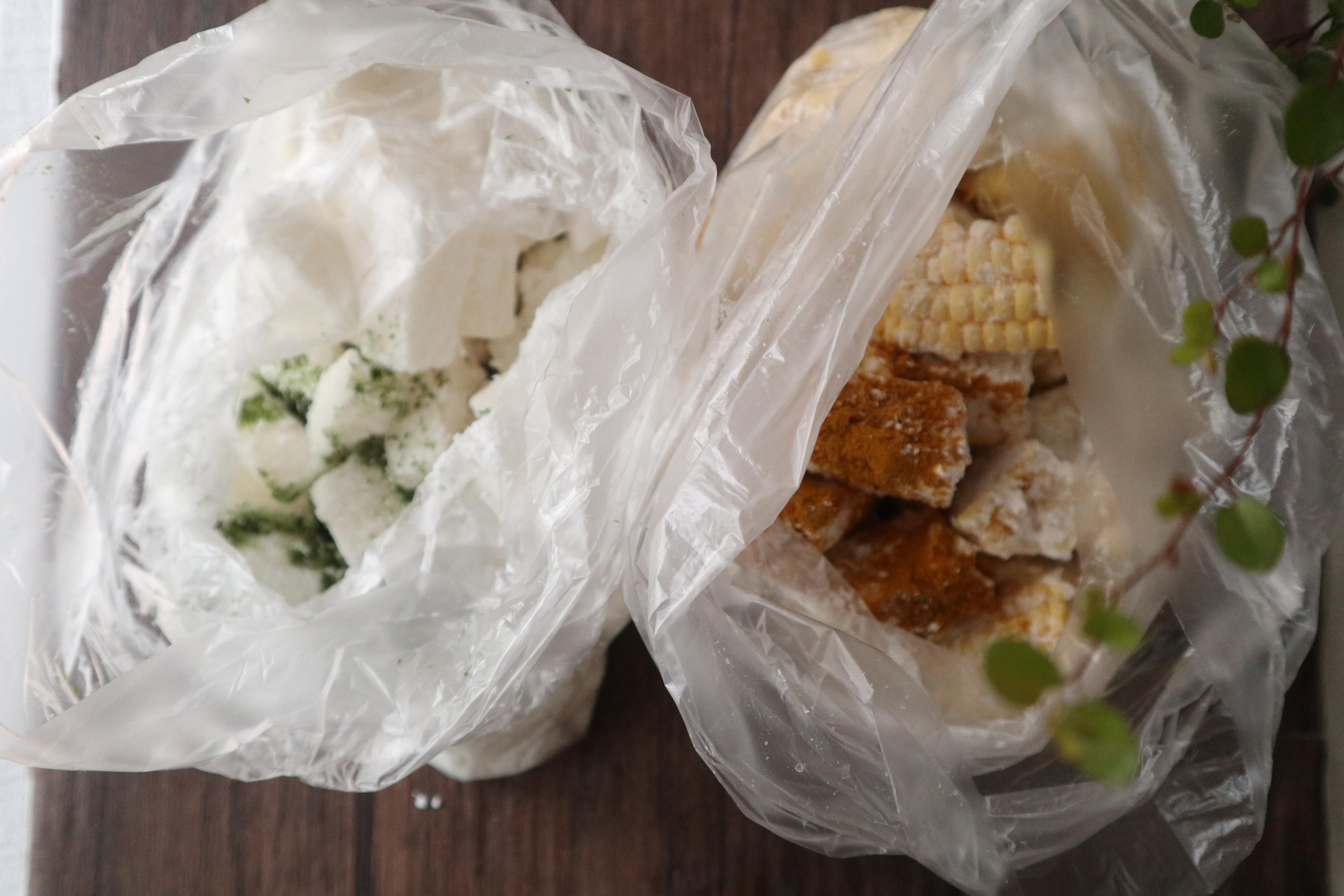 ポリ袋に切ったとうもろこしと長芋をそれぞれ入れます。