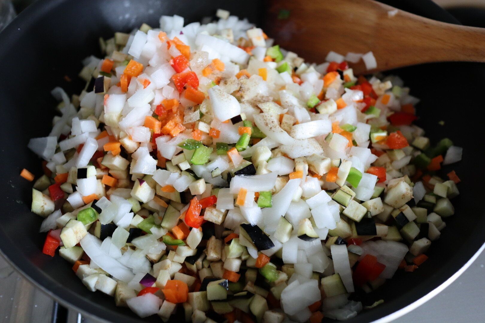 1.玉ねぎ、人参、茄子、赤パプリカ、ピーマンを5mm角くらいのみじん切りにする