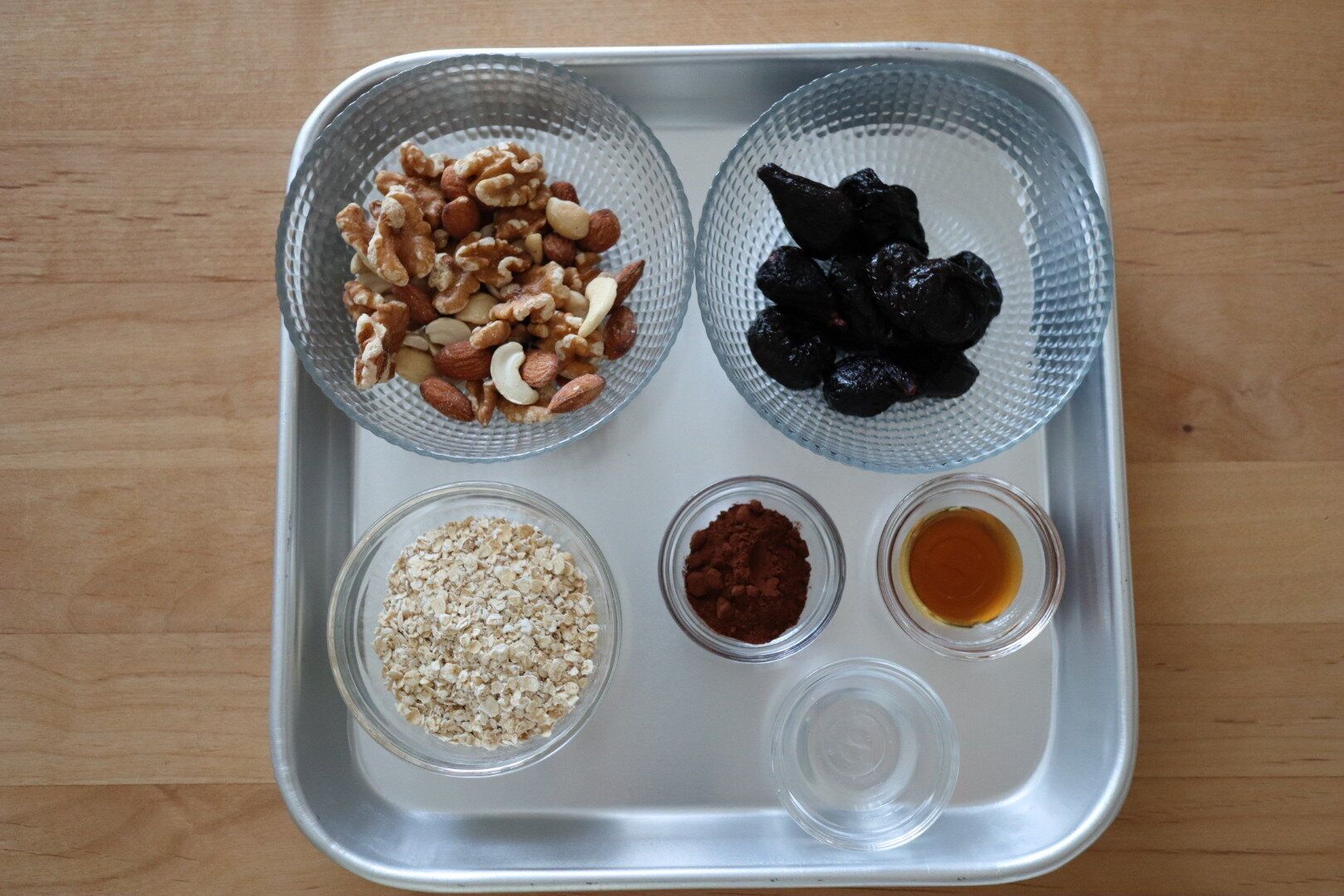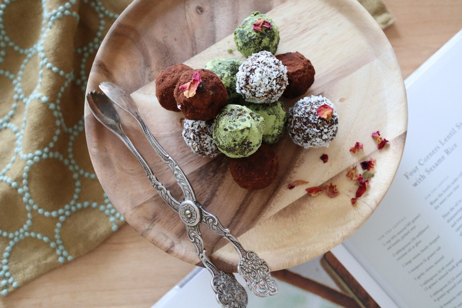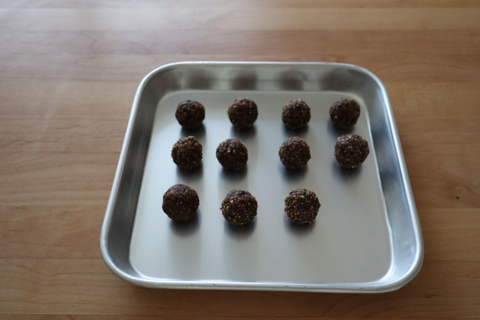 エナジーボール(ブリスボール)とは、見た目はチョコレートトリュフのようなもので、ドライフルーツ、ナッツを砕いて丸めてココアパウダーなどをまぶしてつくっています。加熱しないため、食品の栄養分をそのままとることができ、砂糖、乳製品、グルテンフリーで、自然な甘さでできています。