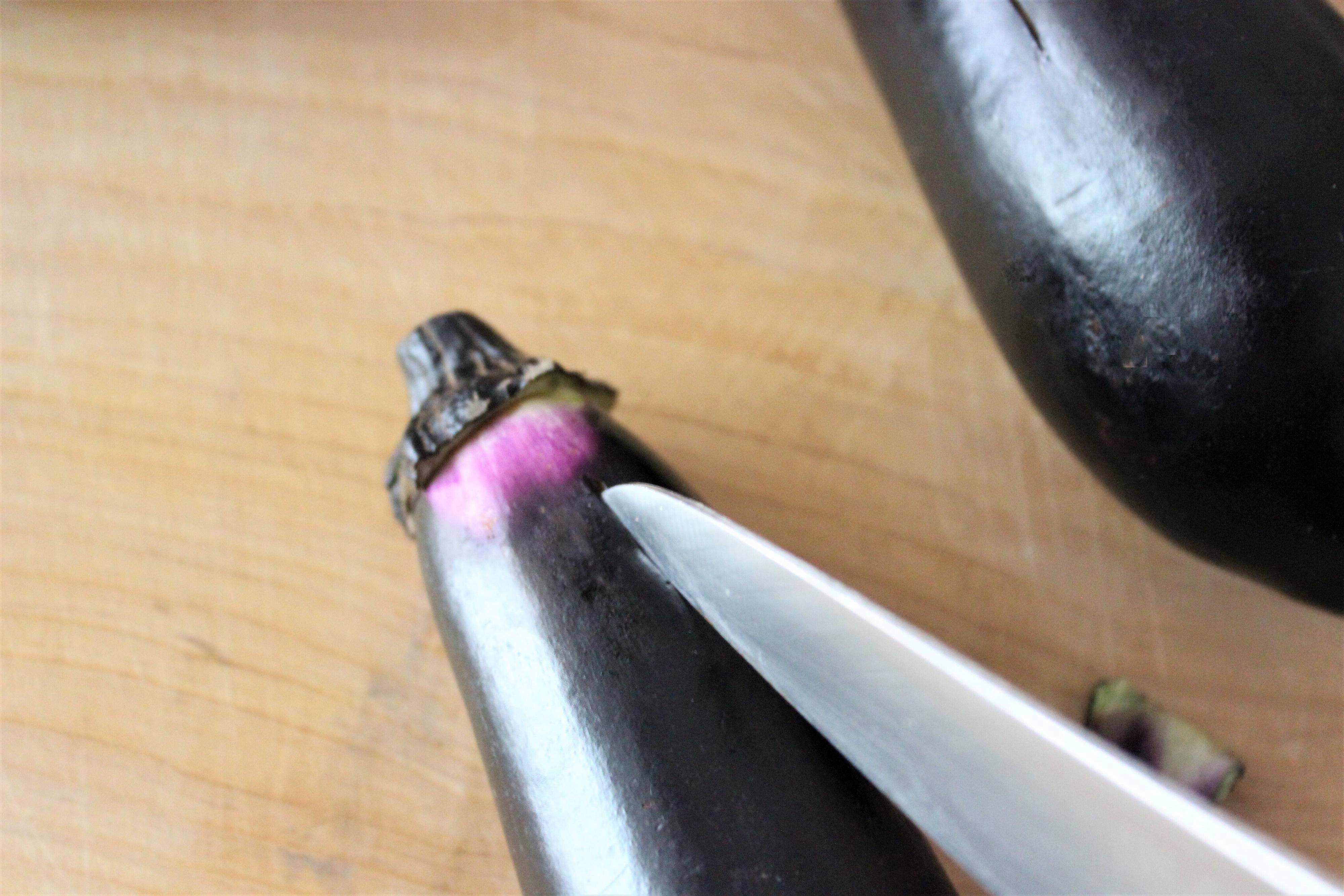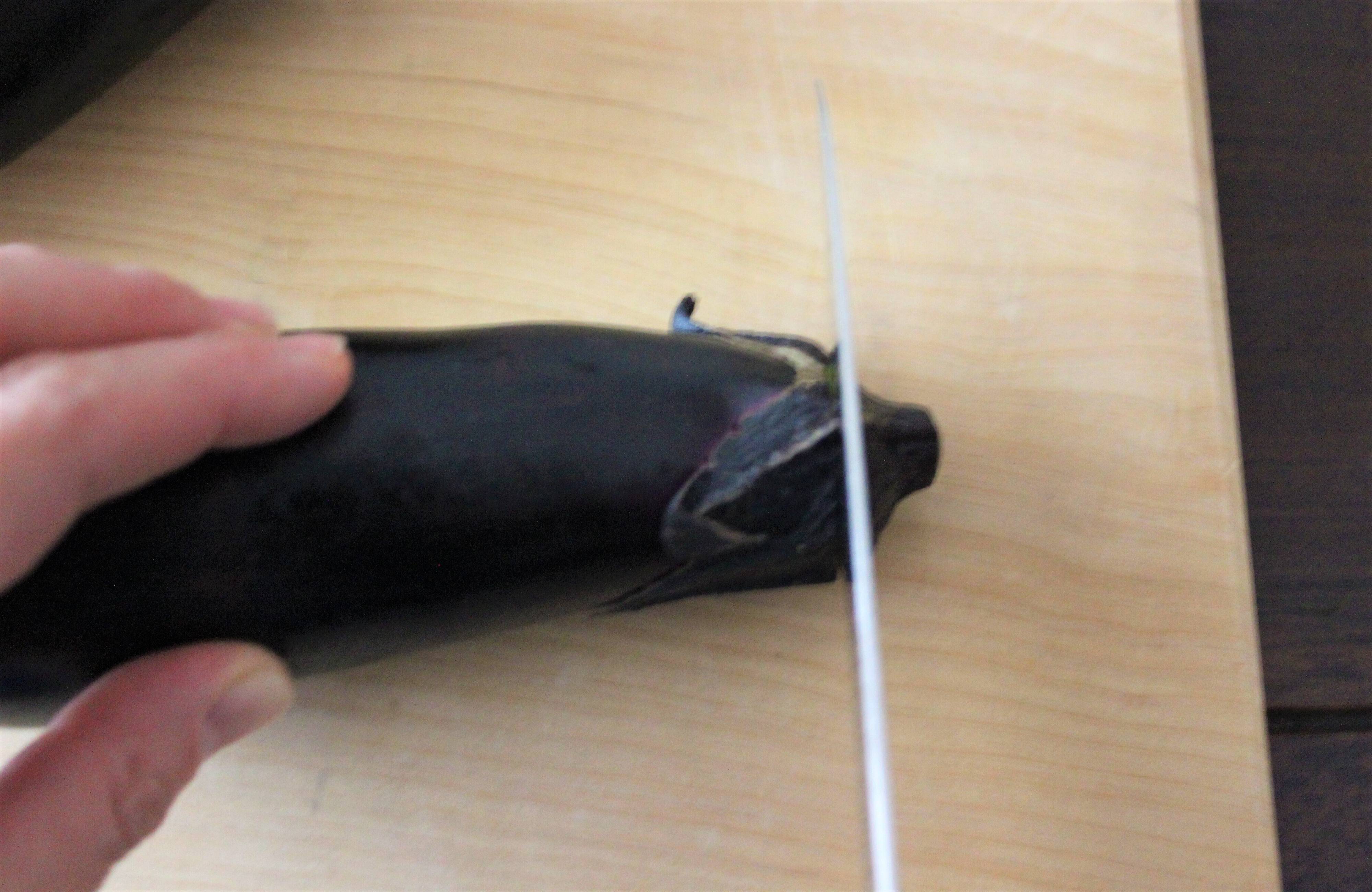 2.ガクの根元に包丁をあて、ぐるりと茄子をまわしてガクをとる。