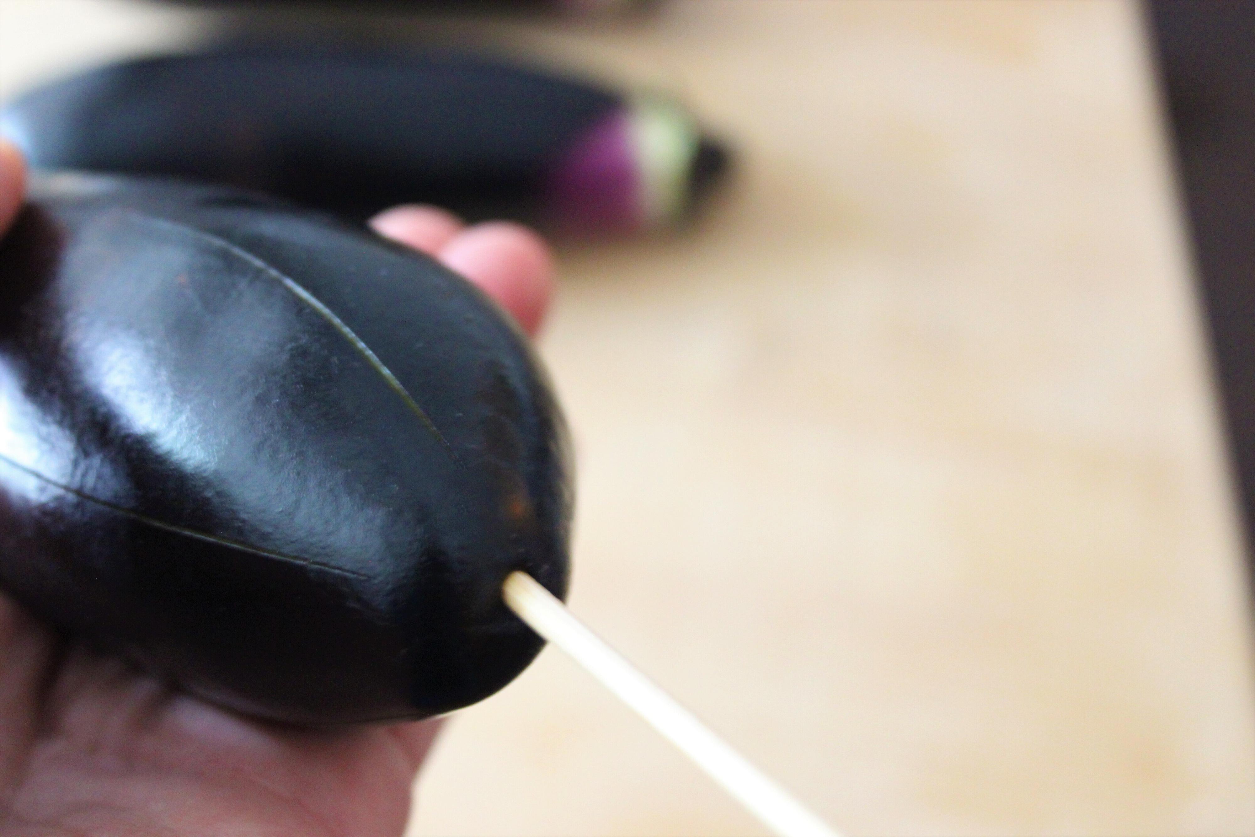 4.茄子のおしりのところに竹串をさして、穴をあける。