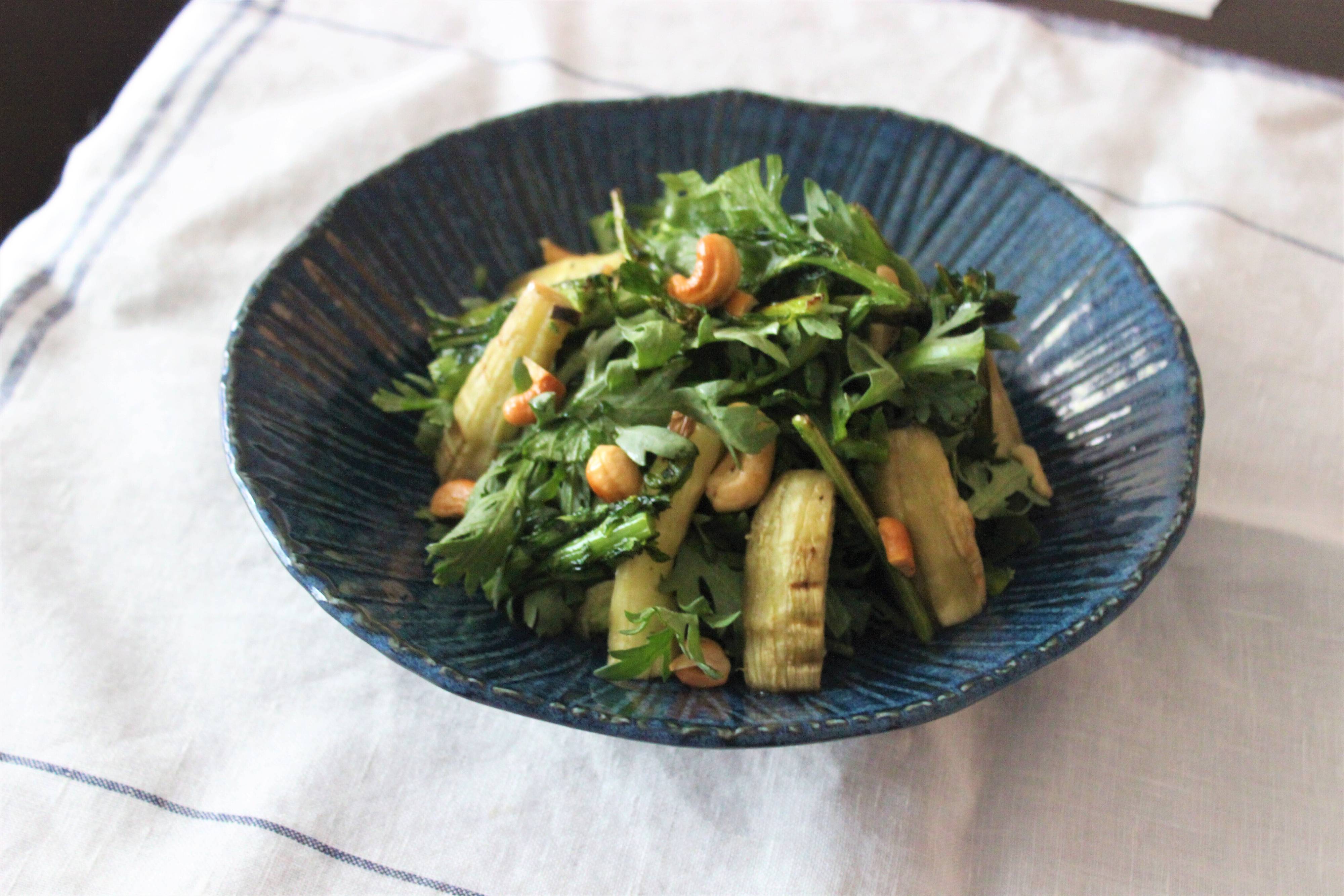 私の一番のお気に入りは、サラダに混ぜて食べる方法!春菊やパクチー、三つ葉など、パンチのきいた野菜と合います。写真は春菊とナッツのサラダ。春菊の葉をざく切りし、焼き茄子とナッツをトッピングするだけ。春菊の茎とナッツを油で炒めてトッピングすると、さらにおいしくなります。味付けは、胡麻油&ナンプラー&レモン&少しの砂糖でエスニック風にするのが気に入っていますが、ポン酢や市販のドレッシングでもおいしいと思います。