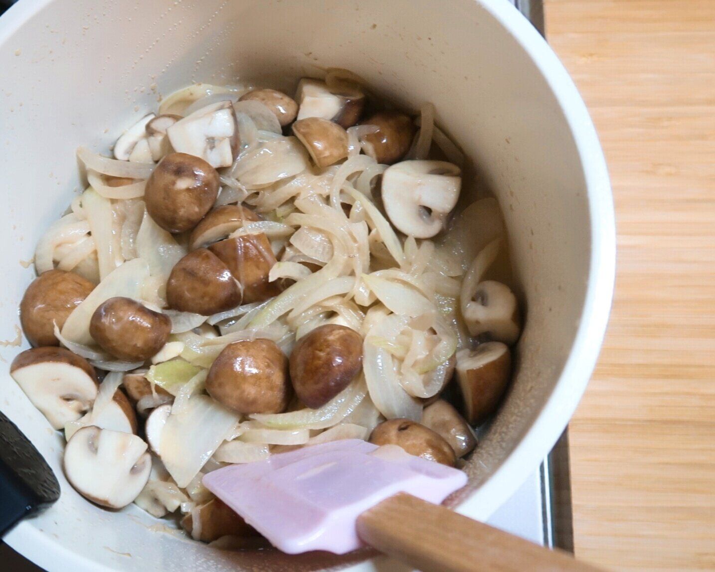 玉ねぎが透き通りしんなりしたら、マッシュルームを加えて中火で約3分炒めます。