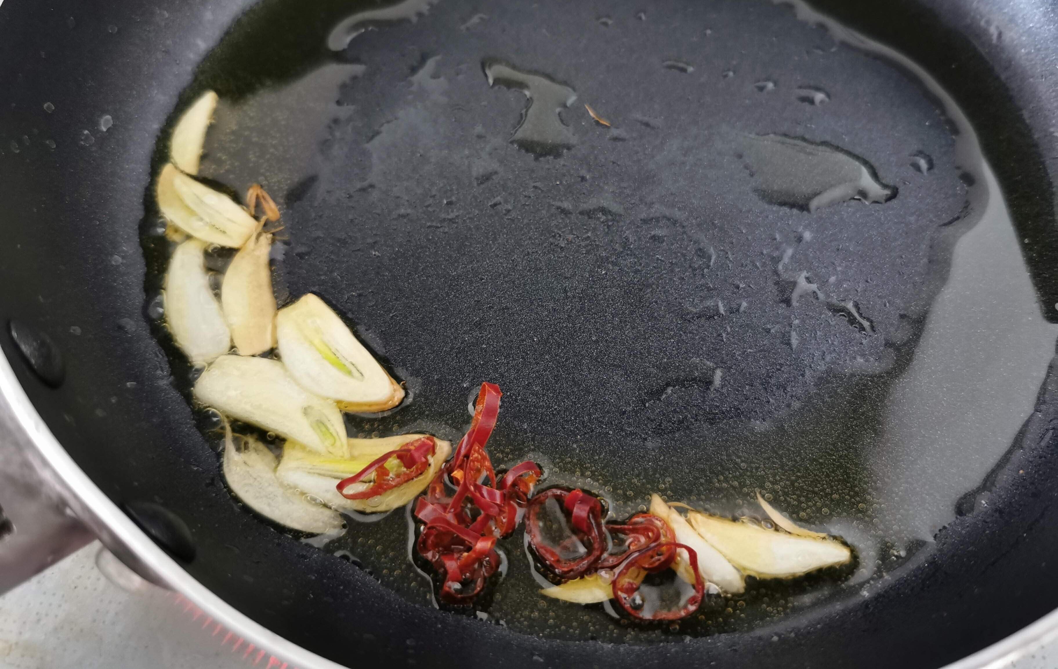 (1)にんにくを薄切りにし、フライパンにオリーブオイルと鷹の爪といっしょに入れて、
