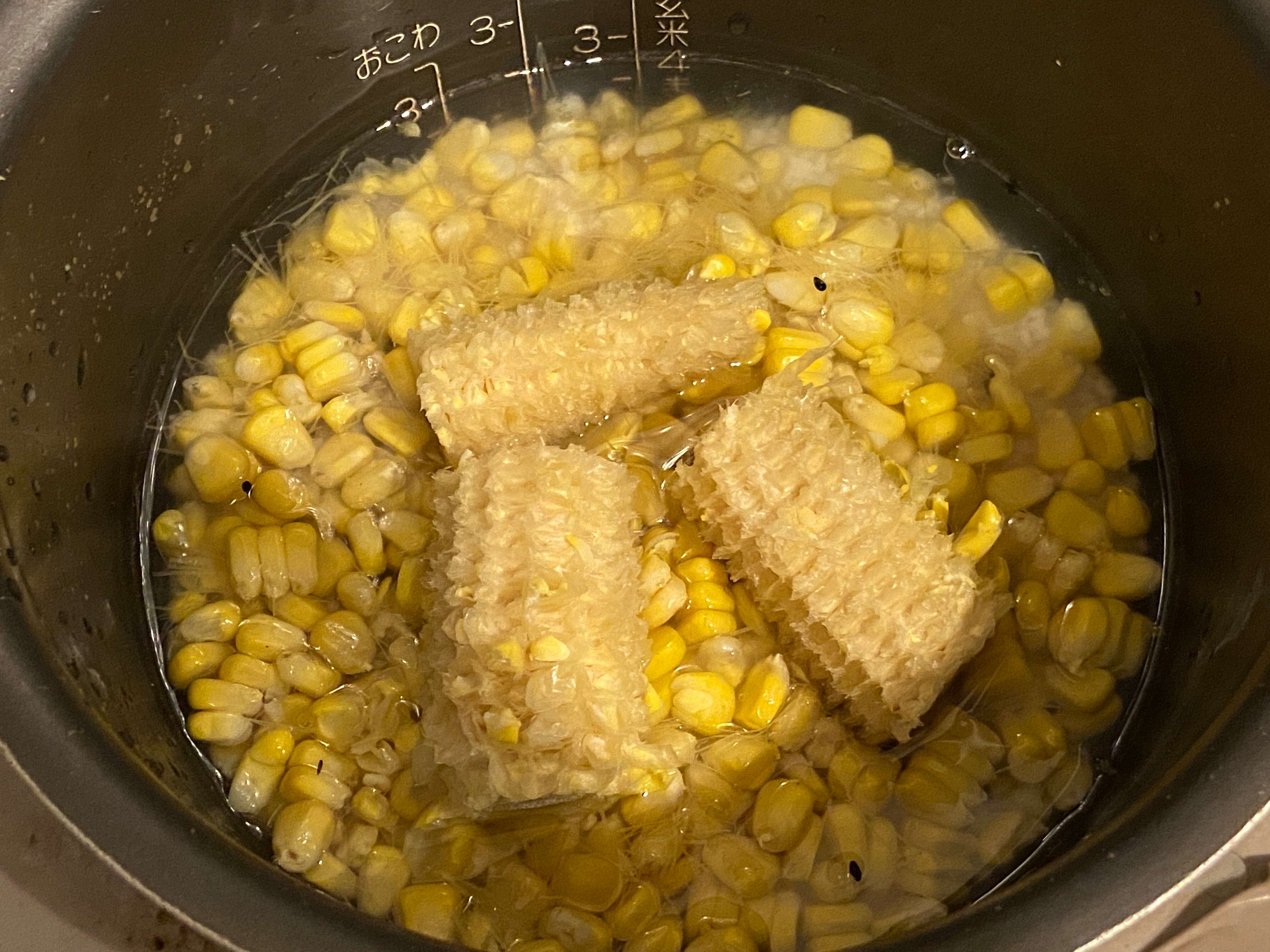とうもろこしの芯からとてもいい出汁が出て、甘くておいしいとうもろこしご飯になります!